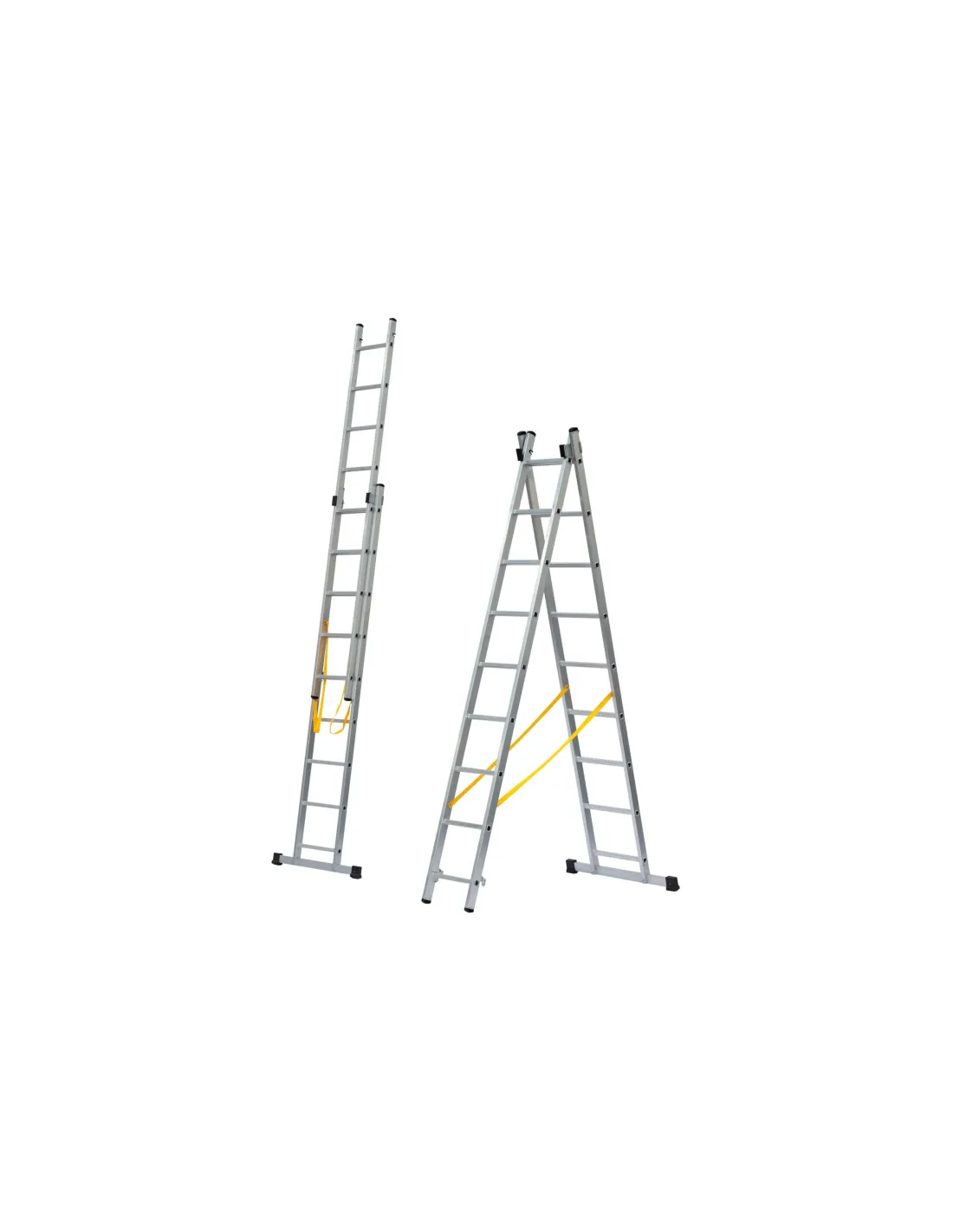 Escalera industrial profesional doble (2 tramos). Fabricada en aluminio nervado para otorgar máxima resistencia. Con nueva bisagra profesional que permite tranformarla fácilmente en tijera y trabajar incluso con desnivel. Ancho interior de 290 mm. Cómodo peldaño antideslizante de 25x25 mm. tacos antideslizantes, base estabilizadora y cintas de seguridad.