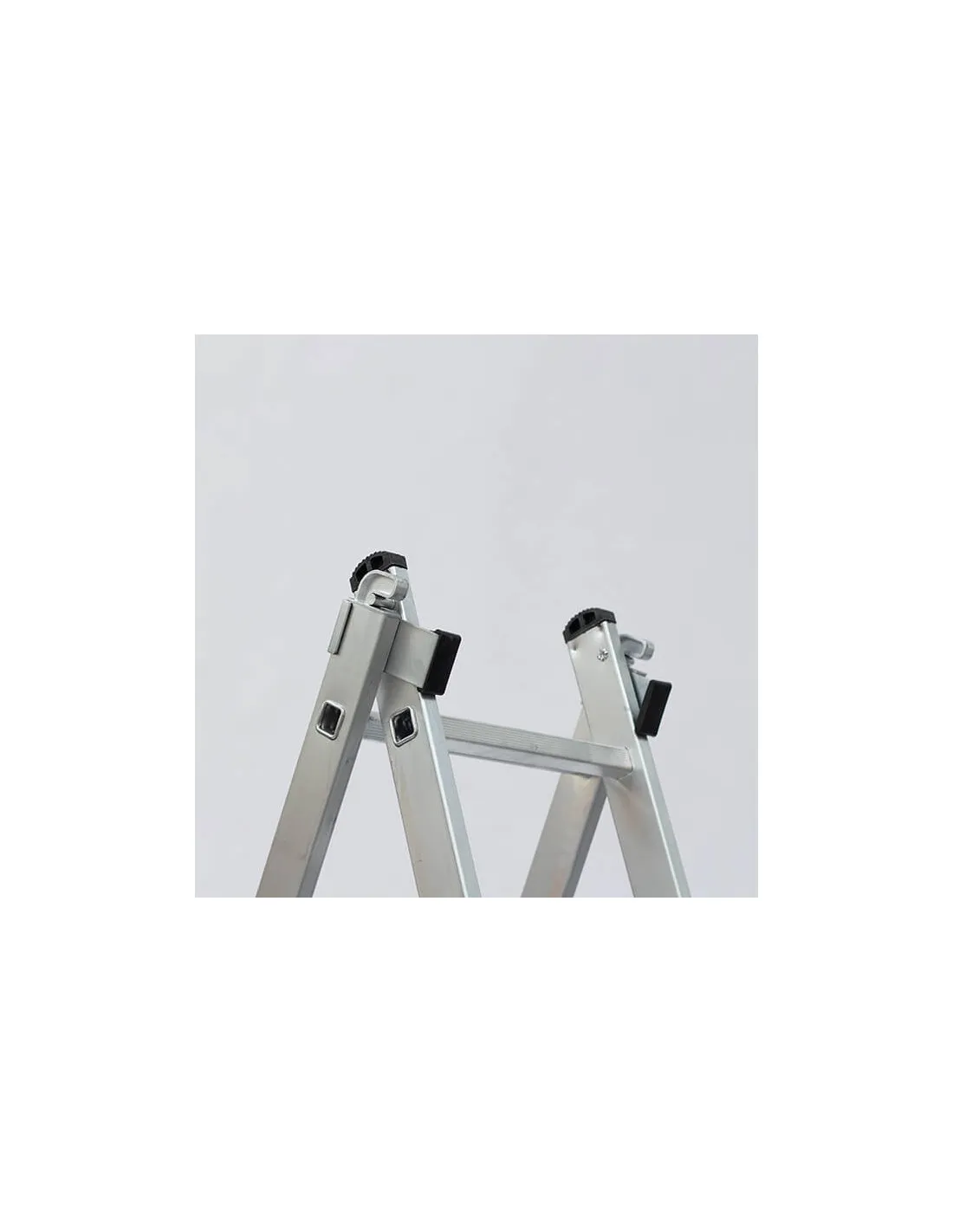 Escalera industrial profesional de aluminio de 2 tramos. Gancho profesional y fácil de utilizar para transformar la escalera en posición de tijera. Cómodo peldaño antideslizante (30 x 30 mm) y ancho interior de la escalera de 300 mm. Base estabilizadora antideslizante y cintas de seguridad.