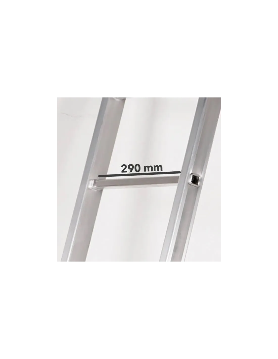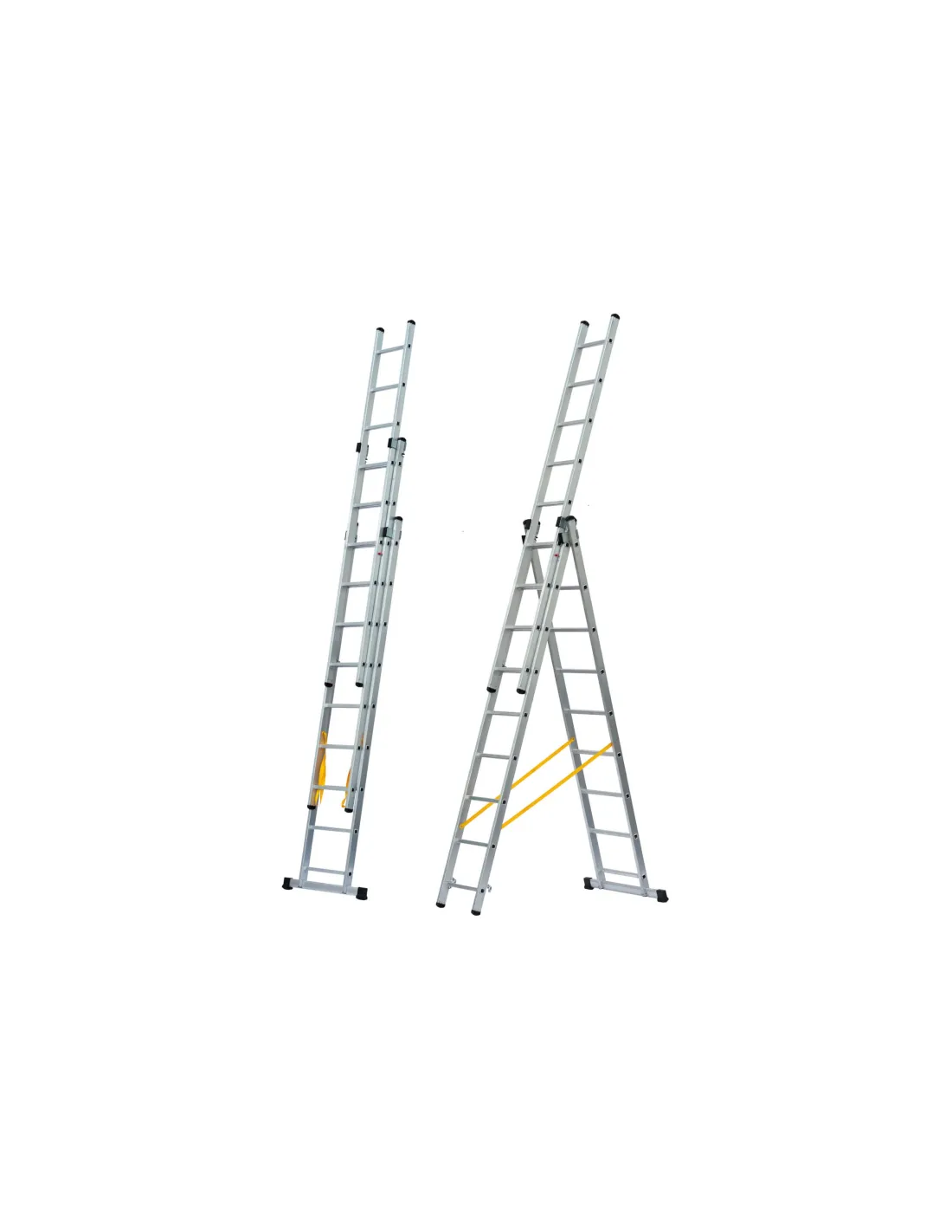 Escalera industrial profesional triple (3 tramos). Fabricada en aluminio nervado para otorgar máxima resistencia. Con nueva bisagra profesional que permite tranformarla fácilmente en tijera y trabajar incluso con desnivel. Ancho interior de 290 mm. Cómodo peldaño antideslizante de 25x25 mm. tacos antideslizantes, base estabilizadora y cintas de seguridad.