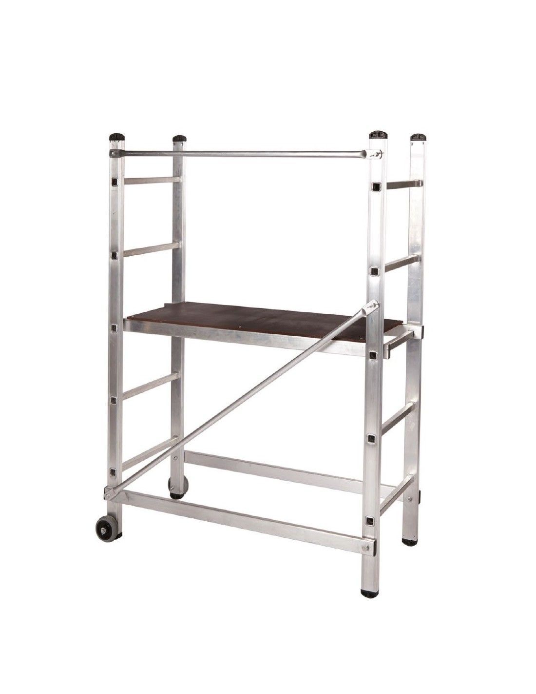 Andamio práctico para trabajos en interiores, ya que su anchura permite el paso por el hueco de las puertas. Versátil al permitir 3 alturas de trabajo hasta un máximo de 3 m. Cómodo al ser montando o desmontado en poco más de dos minutos, sin necesidad de herramientas y moverse fácilmente de un lugar a otro, gracias a la incorporación de ruedas. Plataforma 1100x400 mm.