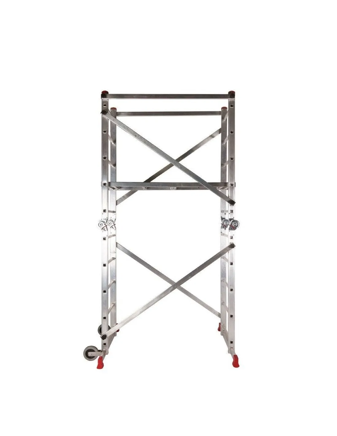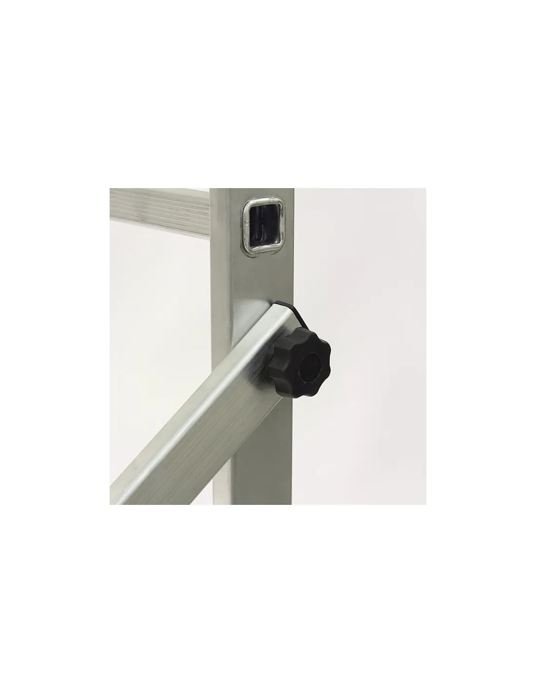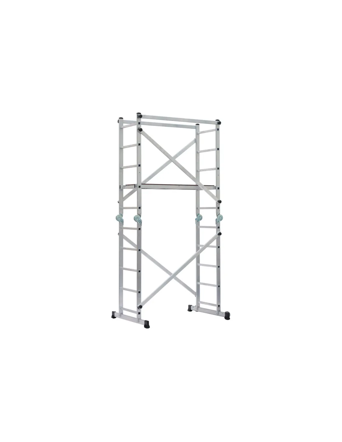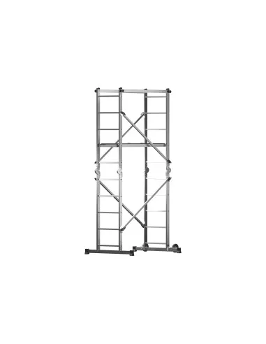 Andamio multifuncional de aluminio. Máxima versatilidad al permitir 3 funciones: Andamio, escalera extensible y escalera de tijera para trabajos hasta 4 m. Cómodo al ser montando o desmontado en poco más de cinco minutos, sin necesidad de herramientas y moverse fácilmente de un lugar a otro, gracias a la incorporación de ruedas. Plataforma 1200x440mm.