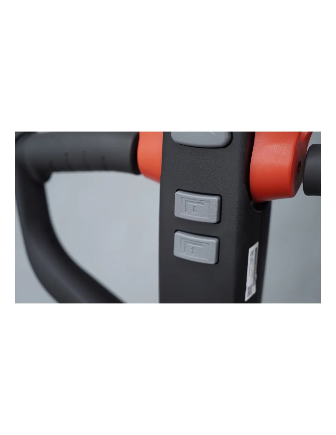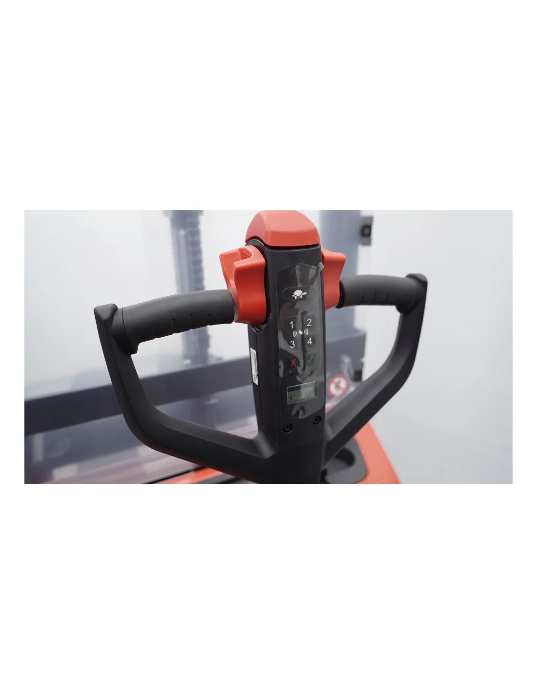 Apilador de elevación y traslación eléctrica para manipulación de cargas de 1.200 Kg en espacios medianos / pequeños. Batería de 24 V. con una autonomía de 3 Horas en continuo. Timón de dirección con muelle de retorno. Cargador incorporado con indicador del estado de las baterías. Rejilla de seguridad. Claxon. Seta de emergencia. Marcado CE.