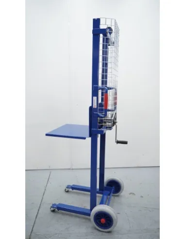 Apilador compacto fabricado en acero, especialmente diseñado para trabajos de carga y descarga de hasta 150 Kg y a una altura de 1,6 m, la solución rápida, económica y segura para sus necesidades en altura. Elevador resistente y manejado con gran facilidad por una sola persona para elevar, descender o desplazar cargas gracias a su carraca de elevación. Cumple con todas las normativas de seguridad, Marcado CE.