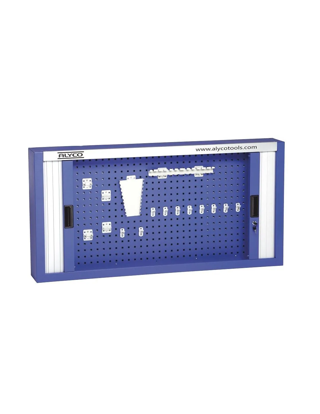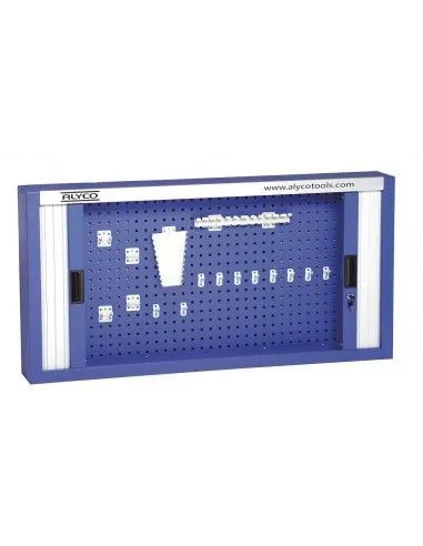 Armario vertical de pared metálico con fondo de panel perforado y estructura de armario con cierre de puertas correderas y cerradura con llave.