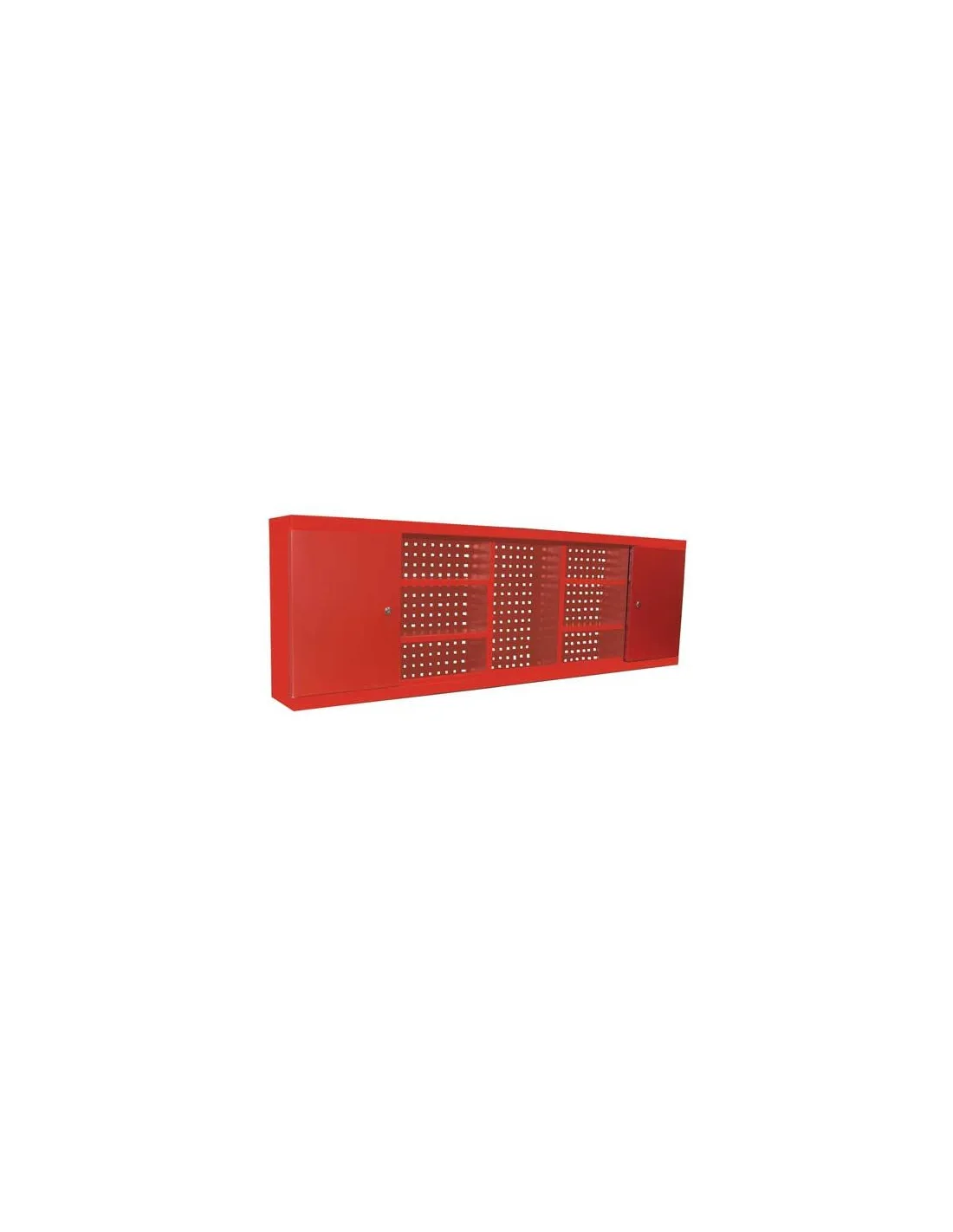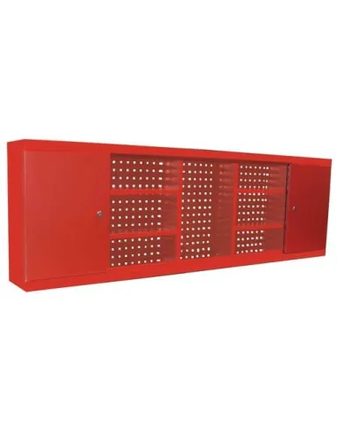 Armario de pared con fondo perforado, diseñado para montaje en pared o sobre bancos, 4 estantes y 2 armarios, uno a cada lado.