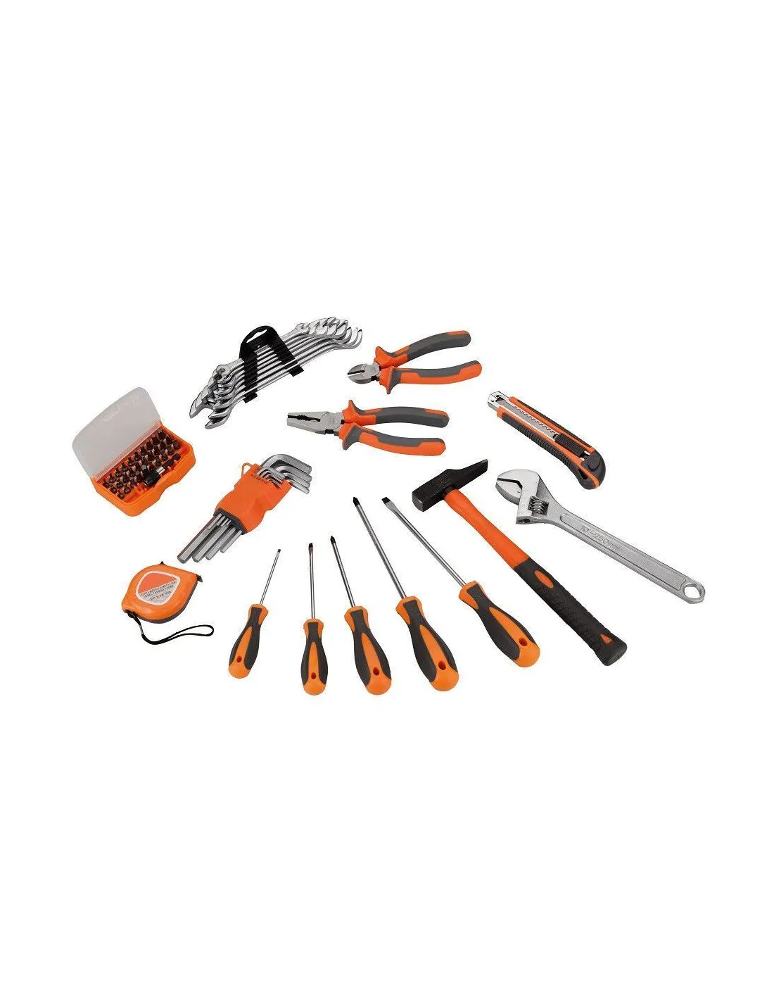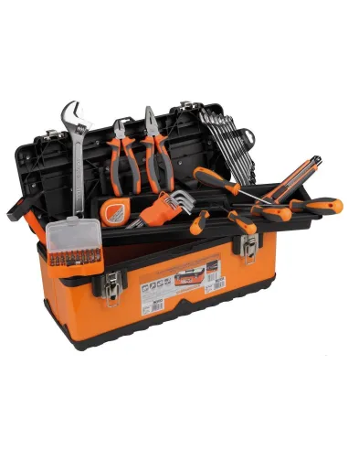 Solución completa para personal con necesidades de desplazamiento y bricoladores caseros para hacer los arreglos precisos. Conjunto de alicates, llaves de apriete, destornilladores, llaves de vaso y muchas mas herramientas con una caja amplia.