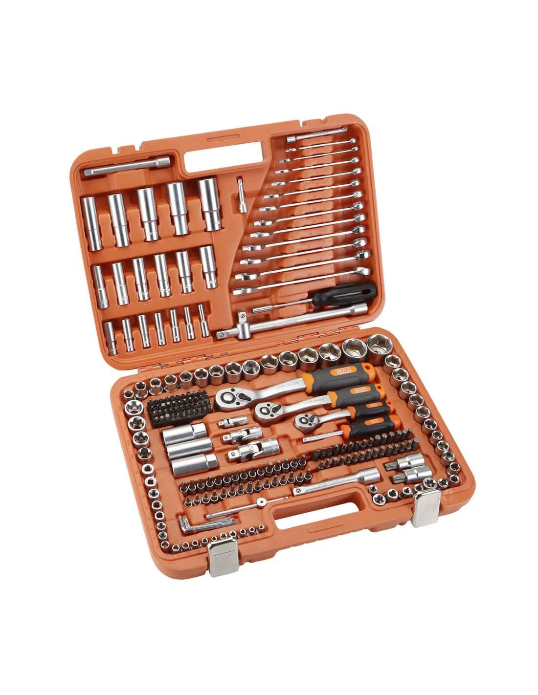 Juego de llaves de vaso de ½”, 3/8" y ¼” de 219 piezas fabricado en acero al Cromo Vanadio, máxima durabilidad y resistencia al desgaste.