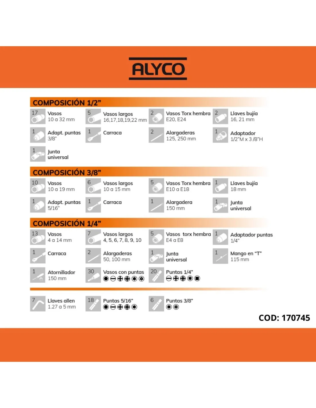 JUEGO LLAVES DE VASO DE 1/2", 1/4" Y 3/8" DE 171 PIEZAS ALYCO 170745