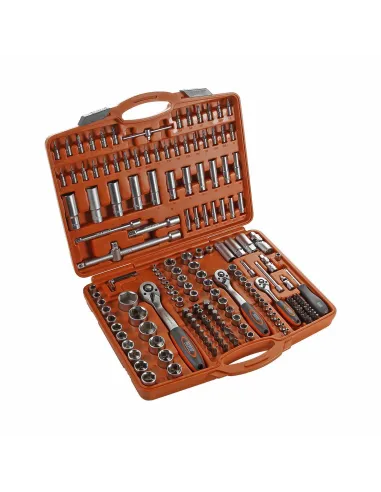 17 vasos (10 a 32 mm) / 5 vasos largos (16, 17, 18, 19, 22 mm) / 1 carraca reversible con expulsor de 72 dientes / 2 alargaderas (125, 250 mm) / 1 junta universal / 1 Adaptador (½”M x 3/8”H) / 1 adaptador de puntas (3/8”) / 2 llaves bujía (16, 21 mm ) / 18 puntas 5/16” (Plana, PH, PZ, Torx, Hexagonal)/ 6 puntas 3/8" (Torx, Torx inviolable) / 7 llaves allen (1.27, 1.5, 2, 2.25, 3, 4, 5) / 2 vasos torx hembra (E20, E24).