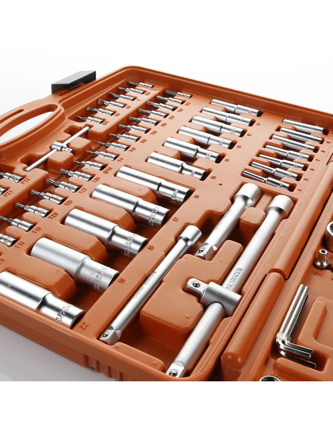 13 vasos (4 a 14 mm) / 7 vasos largos (4 a 10 mm) / 1 carraca reversible con expulsor de 72 dientes / 2 alargaderas (50, 100 mm) / 1 atornillador de 150 mm / 1 mango en T de 115 mm / 1 junta universal / 20 puntas de 1/4" (plana, PH, PZ, Torx, Robertson) / 30 vasos con punta (Plana, PH, PZ, Torx, Torx inviolable, hexagonal)/ 5 vasos Torx hembra (E4 a E8).