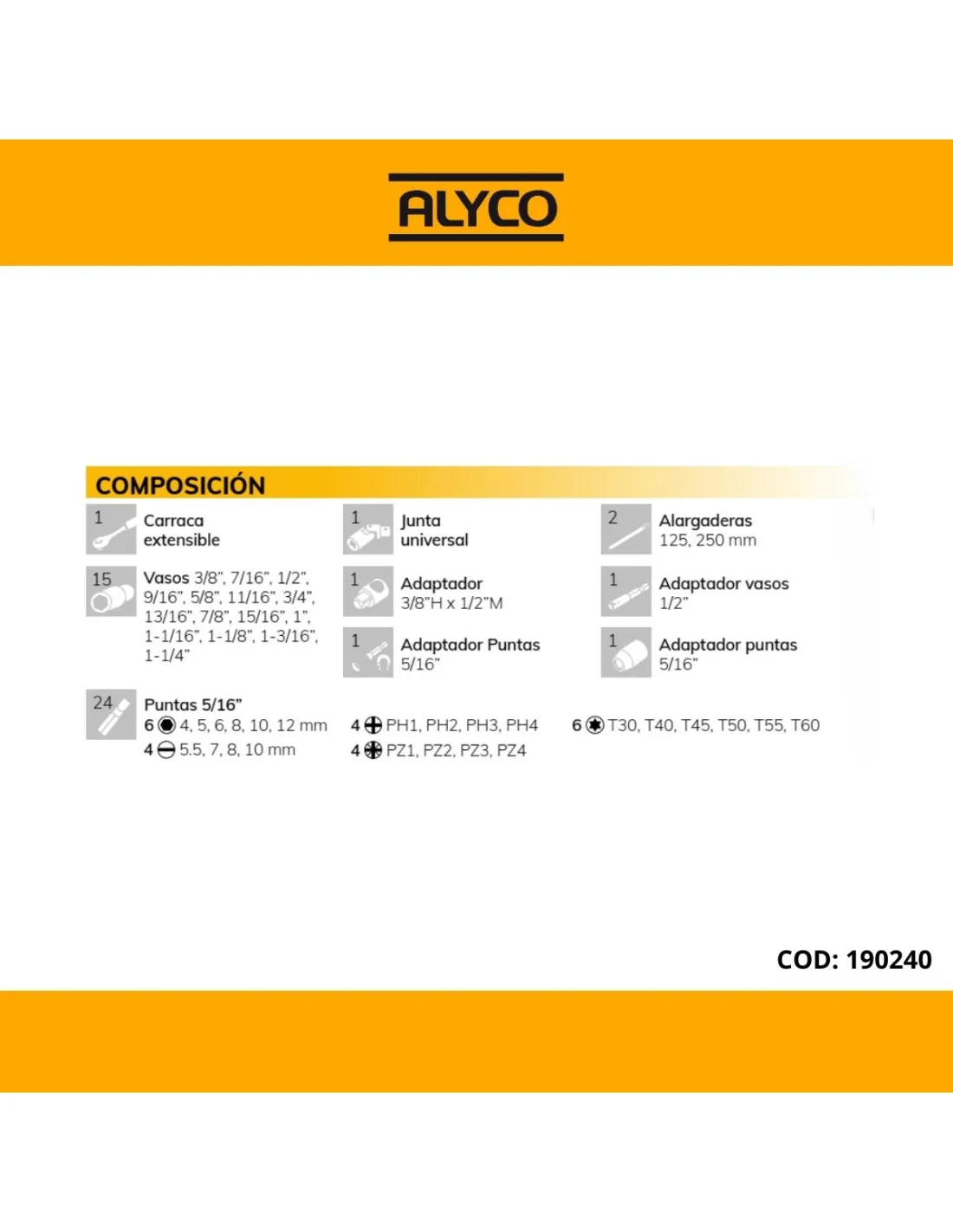 15 vasos / 1 carraca con inversor y expulsor de vasos de 72 dientes / 2 alargaderas (125, 250 mm) / 1 junta universal / 1 adaptador de puntas (5/16”) / 1 adaptador (3/8"Hx1/2"M)/ 24 puntas de 5/16” 6 hexagonales, 6 Torx, 4 PH; 4 PZ y 4 planas