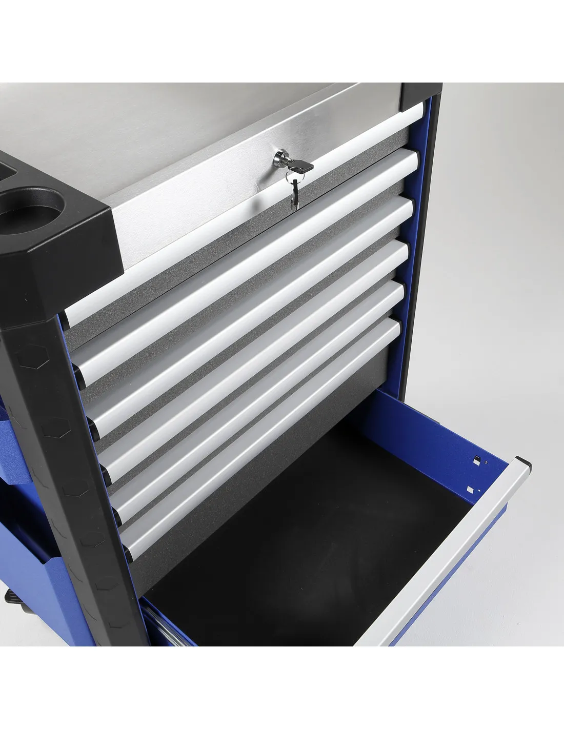 Carro de taller metálico con 7 cajones con estructura reforzada fabricado con chapa de 1 mm de acero con tratamiento anti-corrosión, con protección de pintura epoxi, secado al horno, lo que le da una robustez y capacidad de carga muy elevadas.