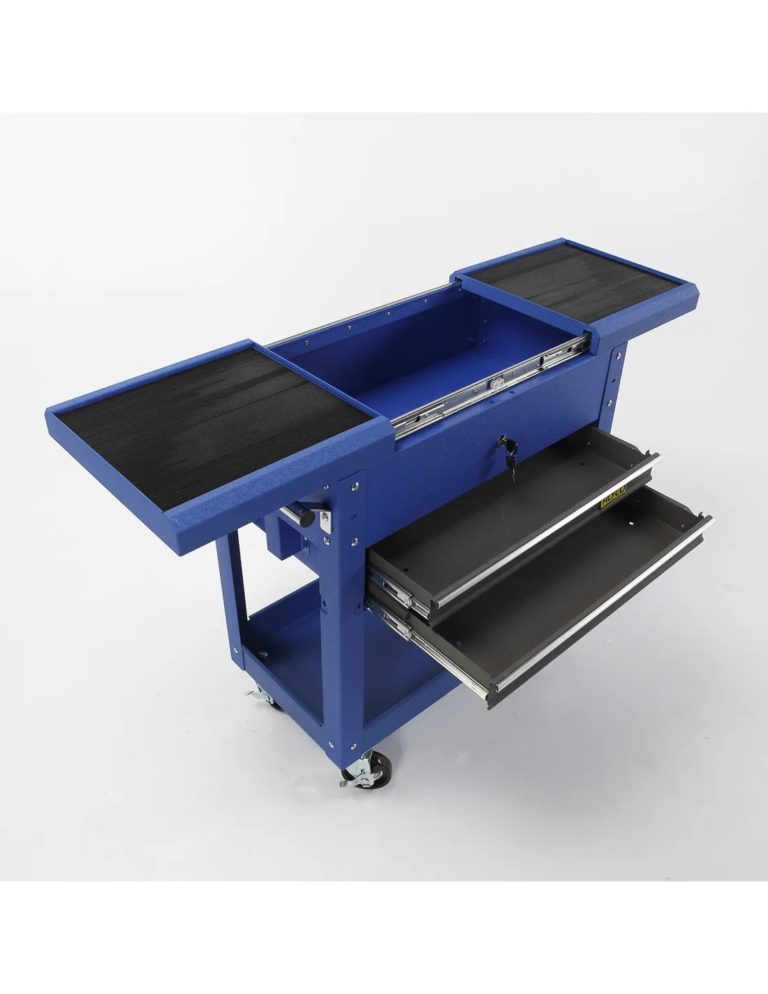 Carro de taller metálico con 2 cajones, bandeja superior y bandeja inferior con amplio espacio para almacenar herramientas. Con estructura reforzada fabricado con chapa de 0,8 mm de acero con tratamiento anti-corrosión, con protección de pintura epoxi, secado al horno, lo que le da una robustez y capacidad de carga muy elevadas.