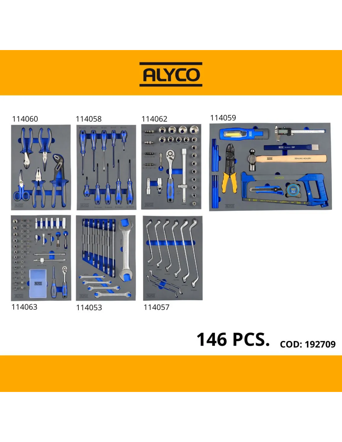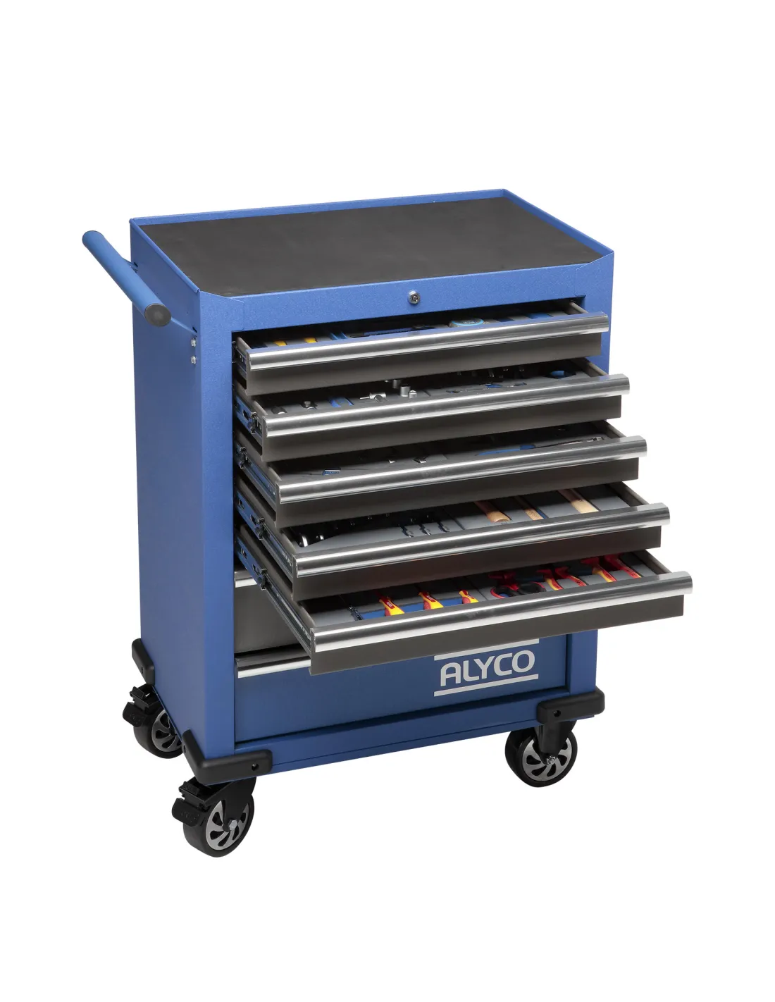 - Surtido completo de 142 herramientas Alyco distribuidas en 7 módulos diferentes para una perfecta organización y custodia.