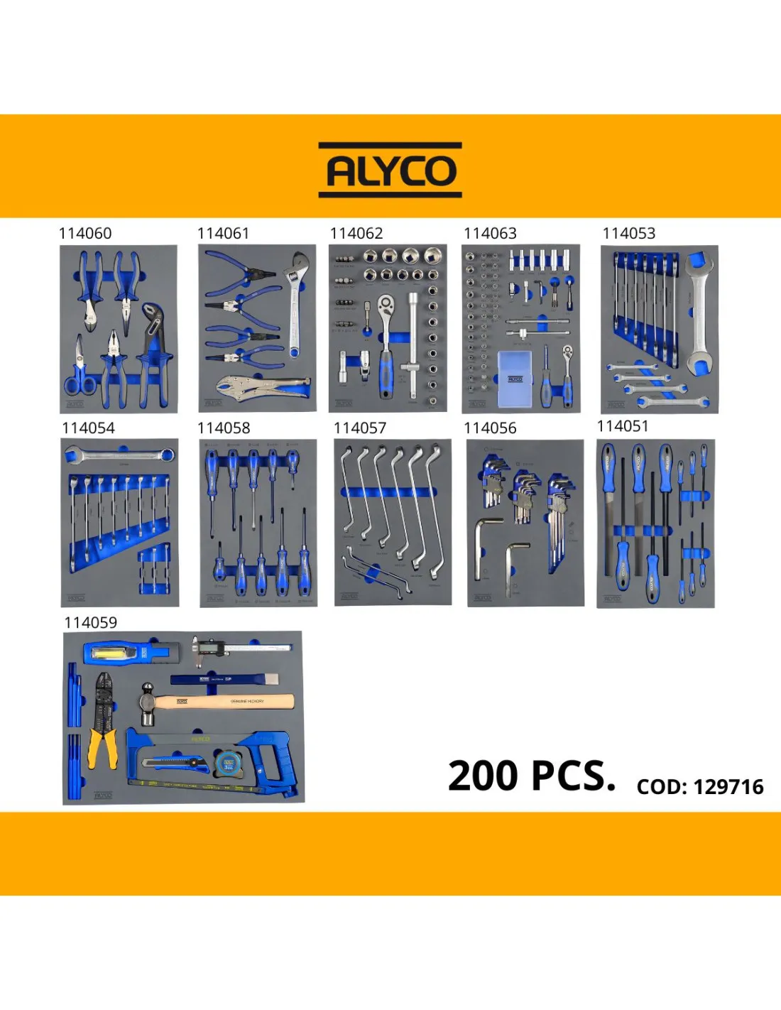 Surtido maxi de 200 herramientas Alyco distribuidas en 11 módulos diferentes para una perfecta organización y custodia.
