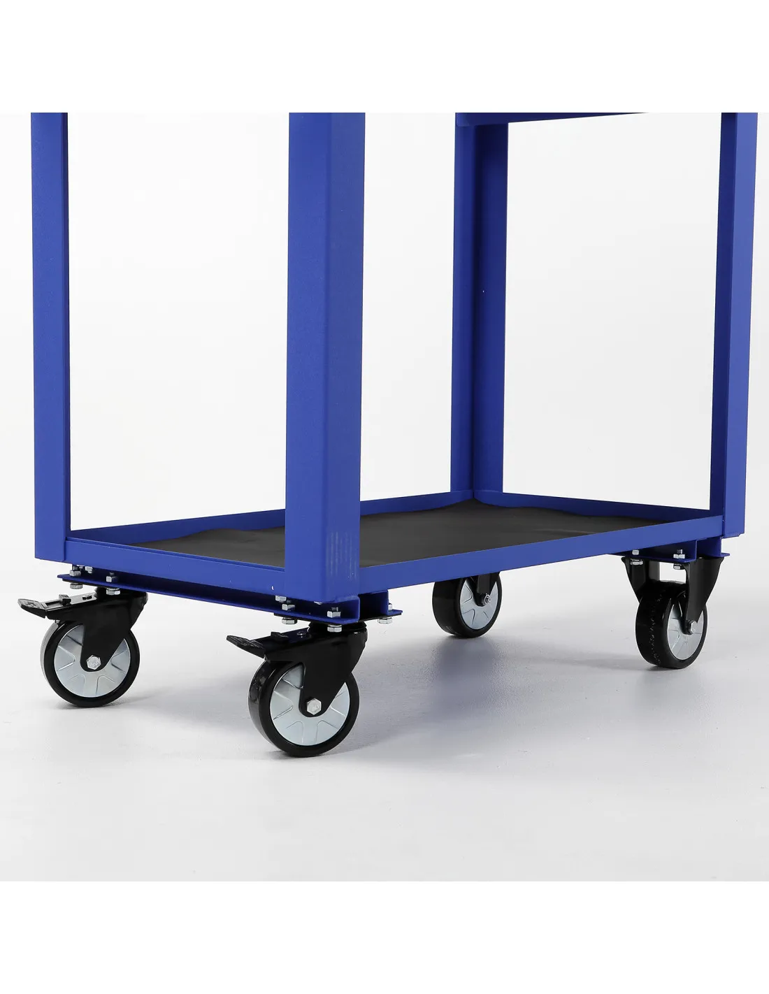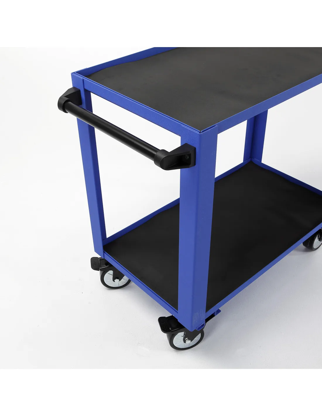 Carro de taller metálico reforzado con 2 bandejas de apoyo para herramientas, con estructura reforzada fabricado con chapa de acero con tratamiento anti-corrosión, con protección de pintura epoxi, secado al horno, lo que le da una robustez y capacidad de carga muy elevadas.
