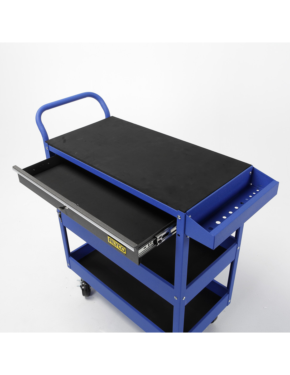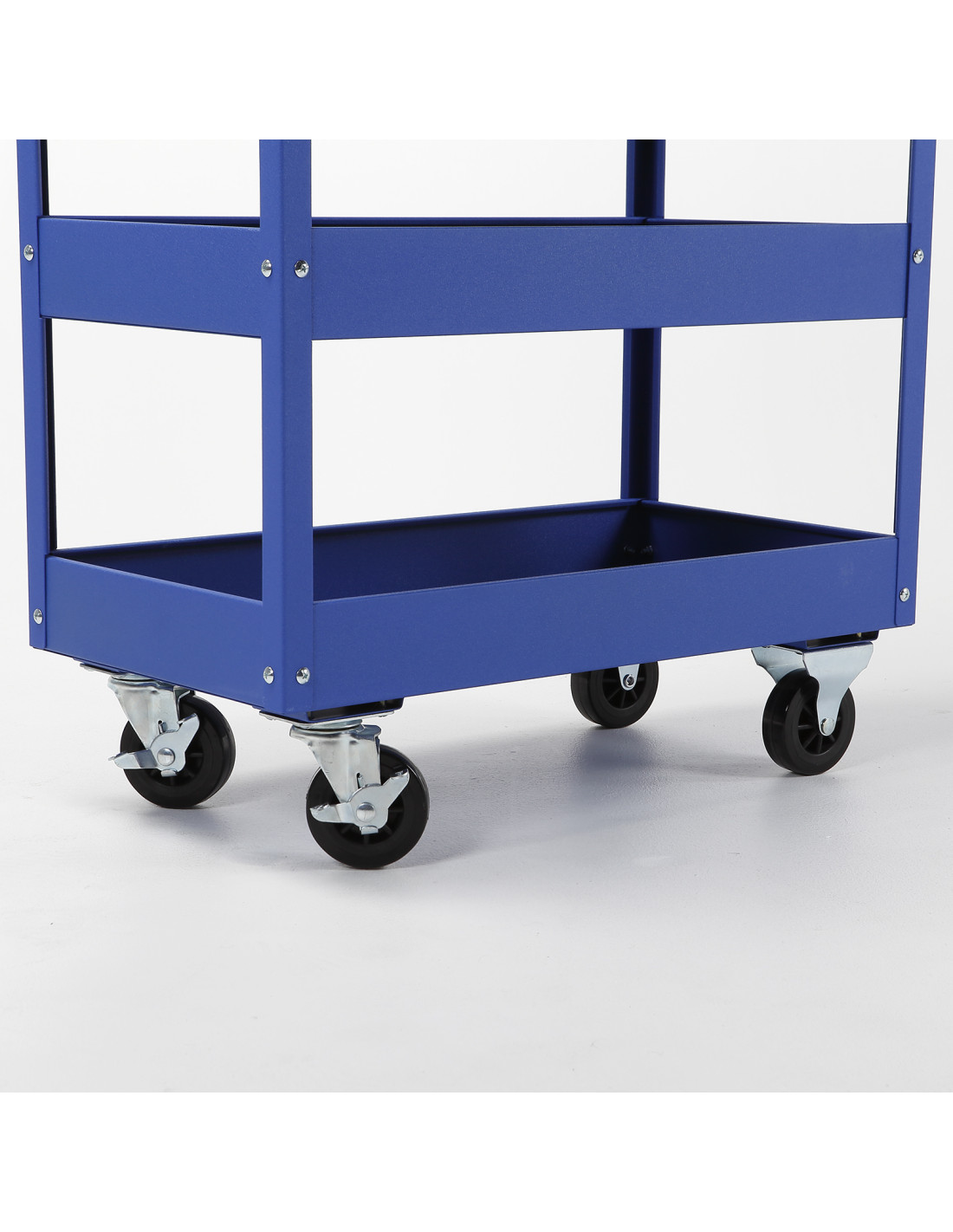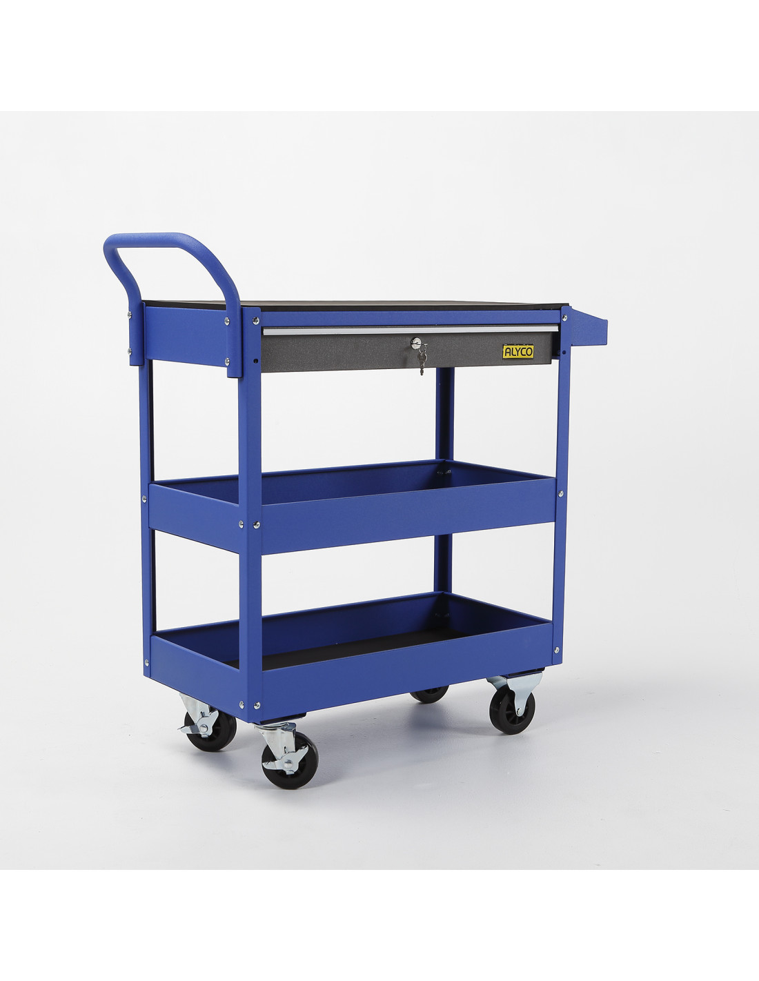 Carro de taller metálico reforzado con 3 bandejas de apoyo para herramientas y un cajón con cerradura, con estructura reforzada fabricado con chapa de acero con tratamiento anti-corrosión, con protección de pintura epoxi, secado al horno, lo que le da una robustez y capacidad de carga muy elevadas.