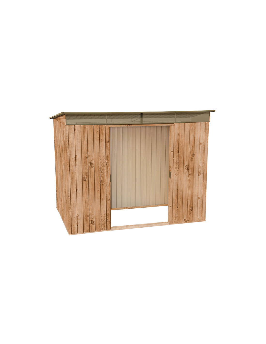 La caseta metálica de jardín "PENTROOF 8X6" en este modelo de imitación madera el acabado de nuestros paneles son pintados, no utilizan acabados como pegatinas, vinilos elementos que puedan estropearse con el paso del tiempo. El acabado será perfecto durante años. Además está fabricada con acero de primer uso y máxima calidad, corrugado de alta densidad en panel de 0,33 mm. con mayor grosor, lo que conlleva una mayor cantidad de acero por cada uno de sus paneles y mayor solidez una vez montada.