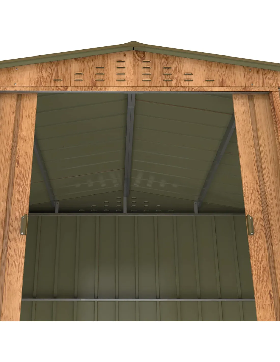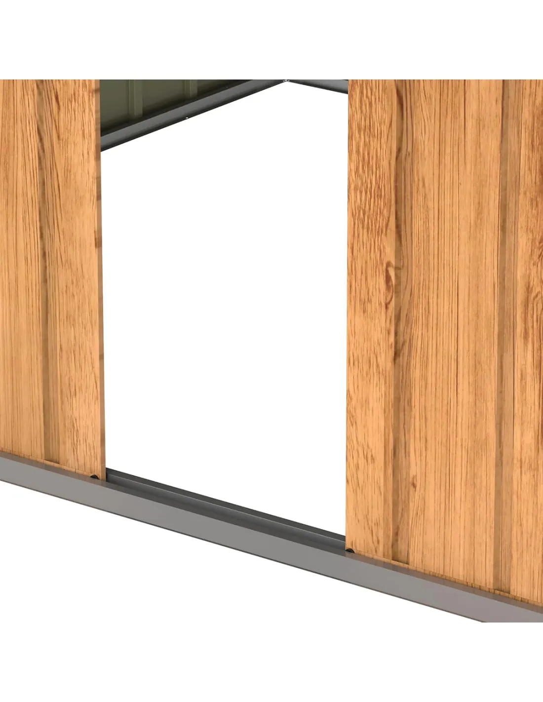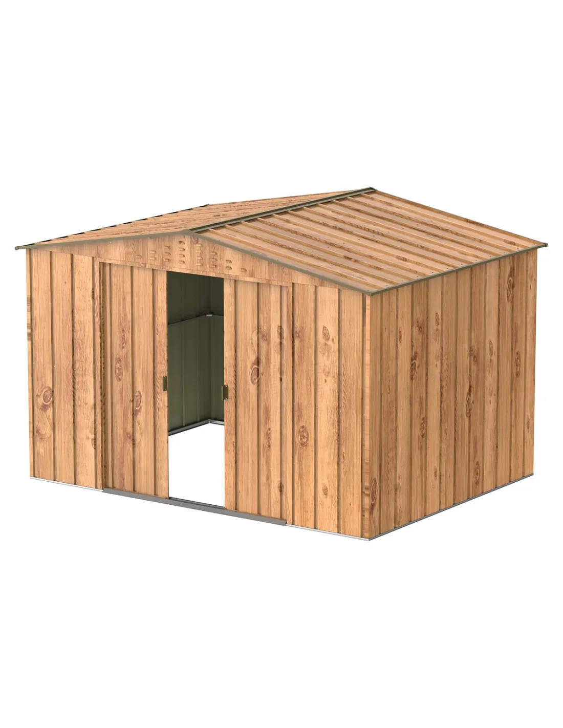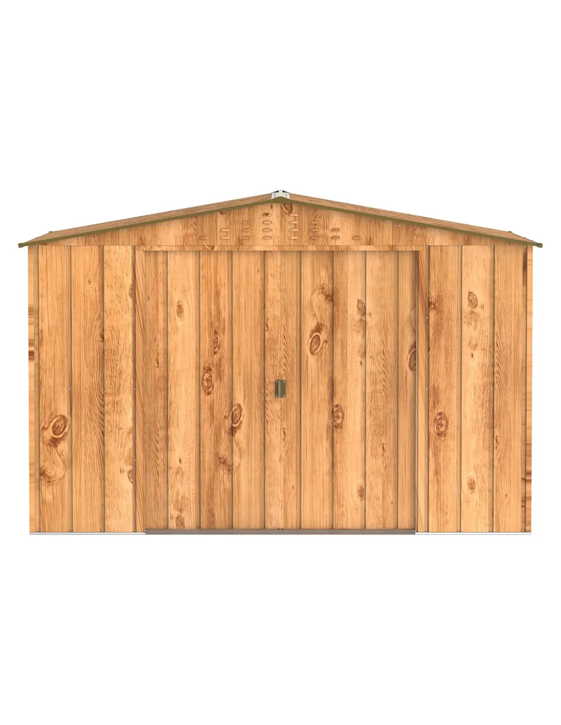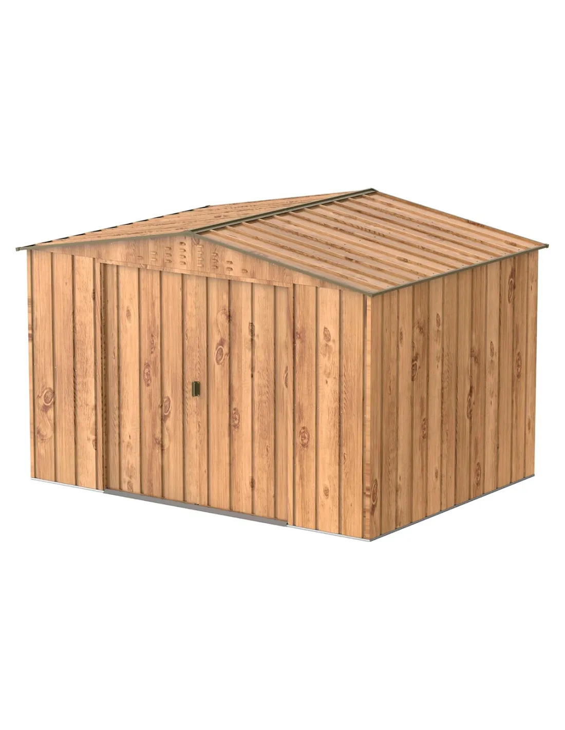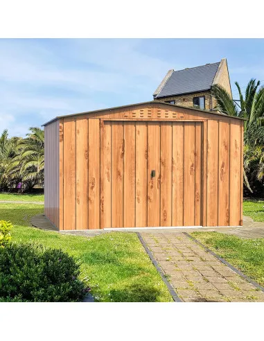 Caseta de jardín en metal de imitación de madera modelo Hércules 10X8 la única con 20 años de garantía, extraordinaria su imitación de madera es tan real que no notarás la diferencia a simple vista. Esta fabricada en acero de primer uso y máxima calidad de 0,33 mm., corrugado de alta densidad en panel, lo que conlleva mayor cantidad de acero por cada uno de sus paneles y mayor solidez una vez montada.