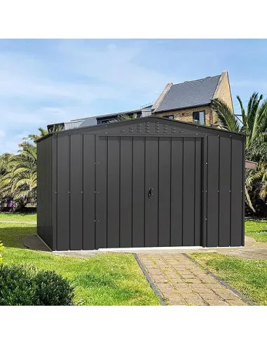 Caseta de metal Top Colossus de color gris antracita, con 20 años de garantía, esta fabricada en acero corrugable de primer uso y de máxima calidad, alta densidad en panel de 0,33 mm., lo que conlleva mayor resistencia por cada uno de sus paneles y mayor solidez una vez montada. Tríple tratamiento exterior e interior para una mayor durabilidad. Ideal para guardar todo tipo de herramientas y maquinaria de jardín. No necesita ningún tipo de mantenimiento adicional por lo que ahorra dinero y tiempo.