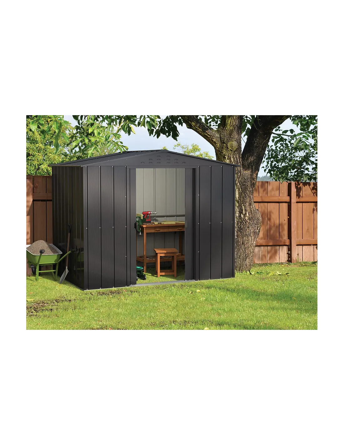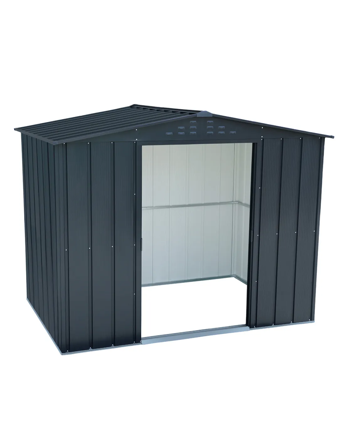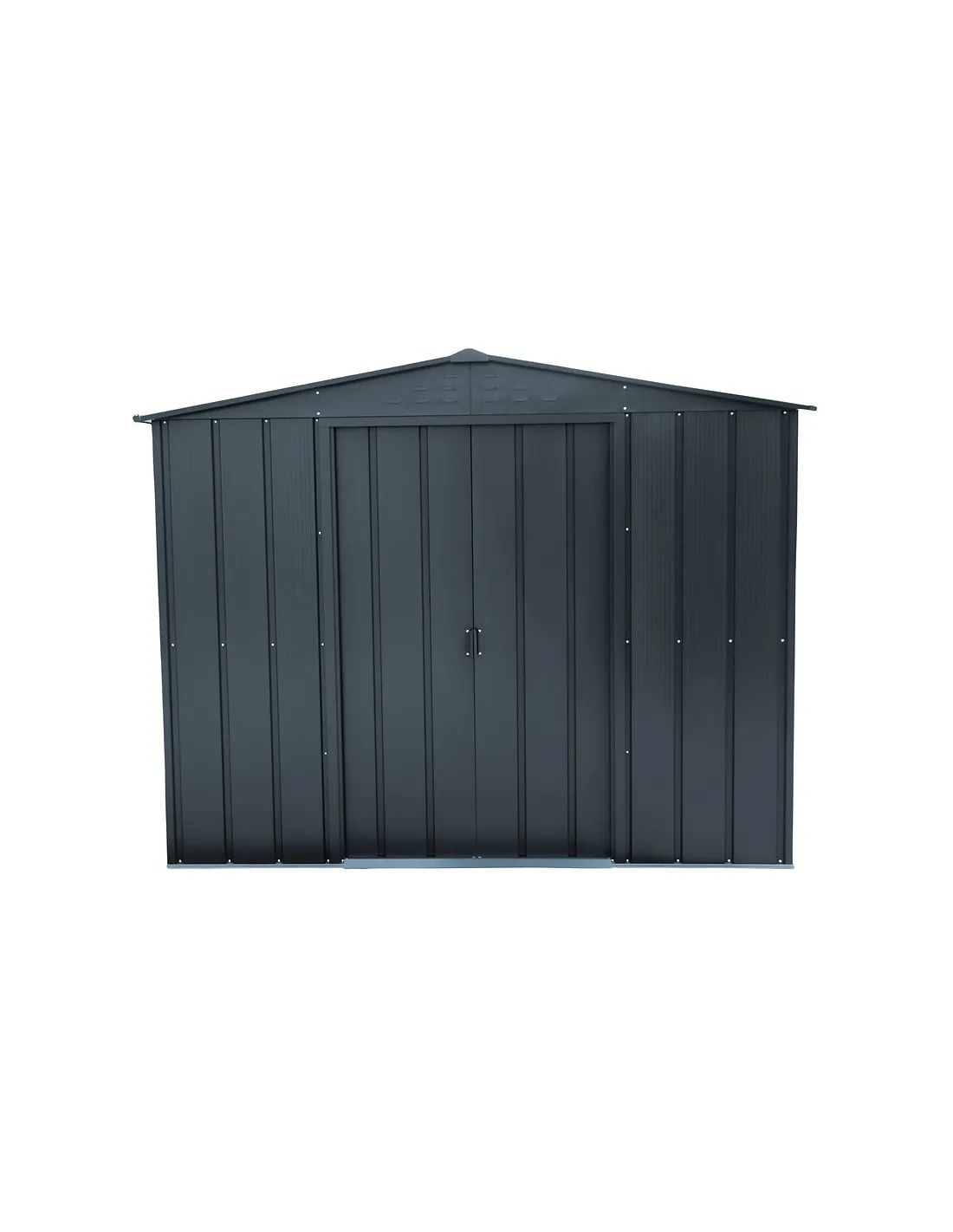 Caseta de metal Top Titán de color gris antracita, con 20 años de garantía, esta fabricada en acero corrugable de primer uso y de máxima calidad, alta densidad en panel de 0,33 mm., lo que conlleva mayor resistencia por cada uno de sus paneles y mayor solidez una vez montada. Tríple tratamiento exterior e interior para una mayor durabilidad. Ideal para guardar todo tipo de herramientas y maquinaria de jardín. No necesita ningún tipo de mantenimiento adicional por lo que ahorra dinero y tiempo.