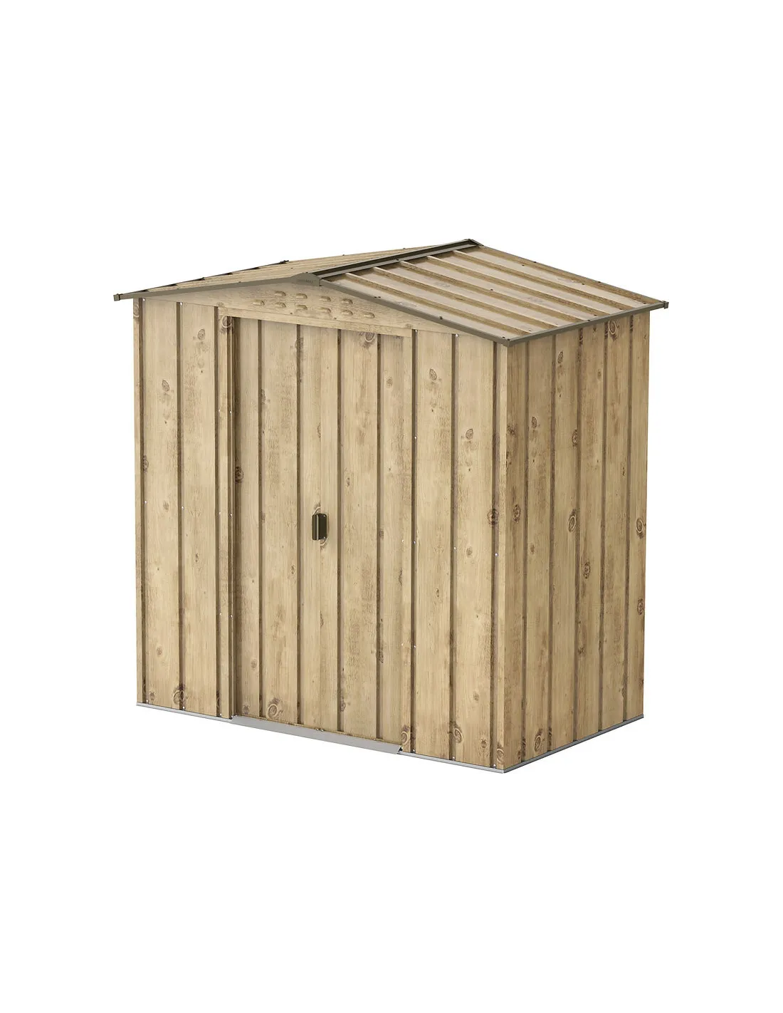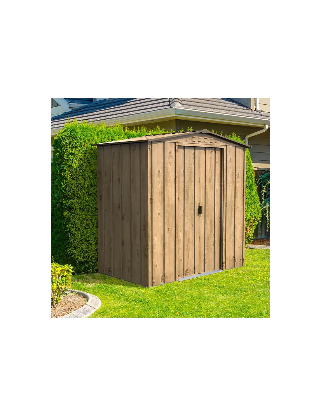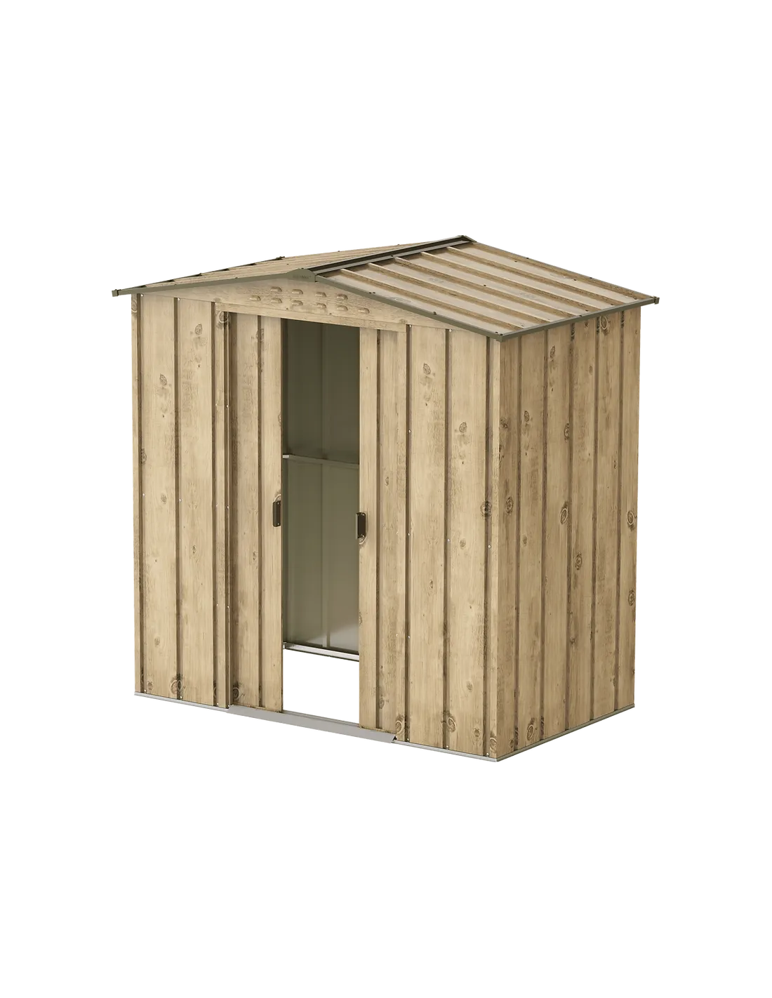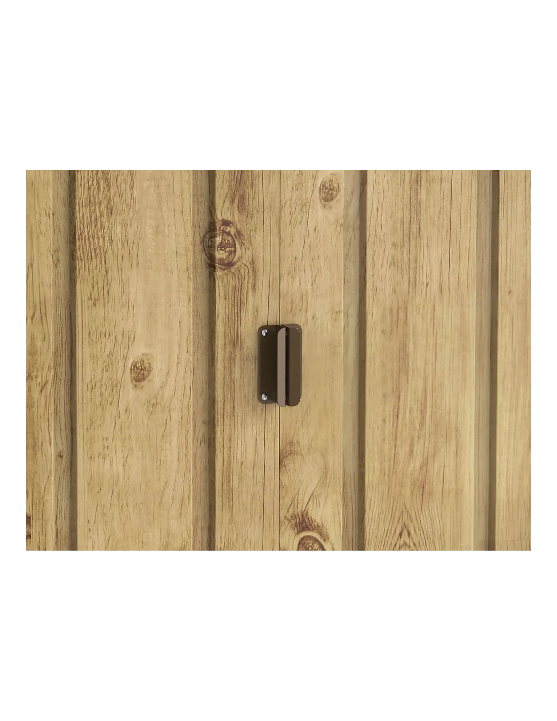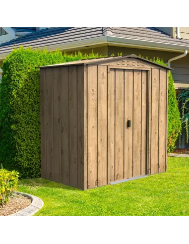 Caseta de jardín en metal de imitación de madera modelo Top Venus 6X4 la única con 20 años de garantía, extraordinaria su imitación de madera es tan real que no notarás la diferencia a simple vista. Esta fabricada en acero de primer uso y máxima calidad de 0,33 mm., corrugado de alta densidad en panel, lo que conlleva mayor cantidad de acero por cada uno de sus paneles y mayor solidez una vez montada.