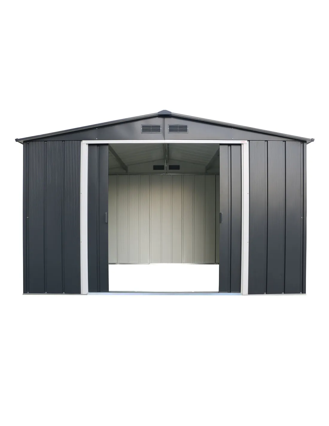 Se accede a la caseta a través desde su doble puerta corredera que permite aprovechar mejor el espacio interior. Impermeable. Estructura de acero galvanizado y un marco de aluminio.