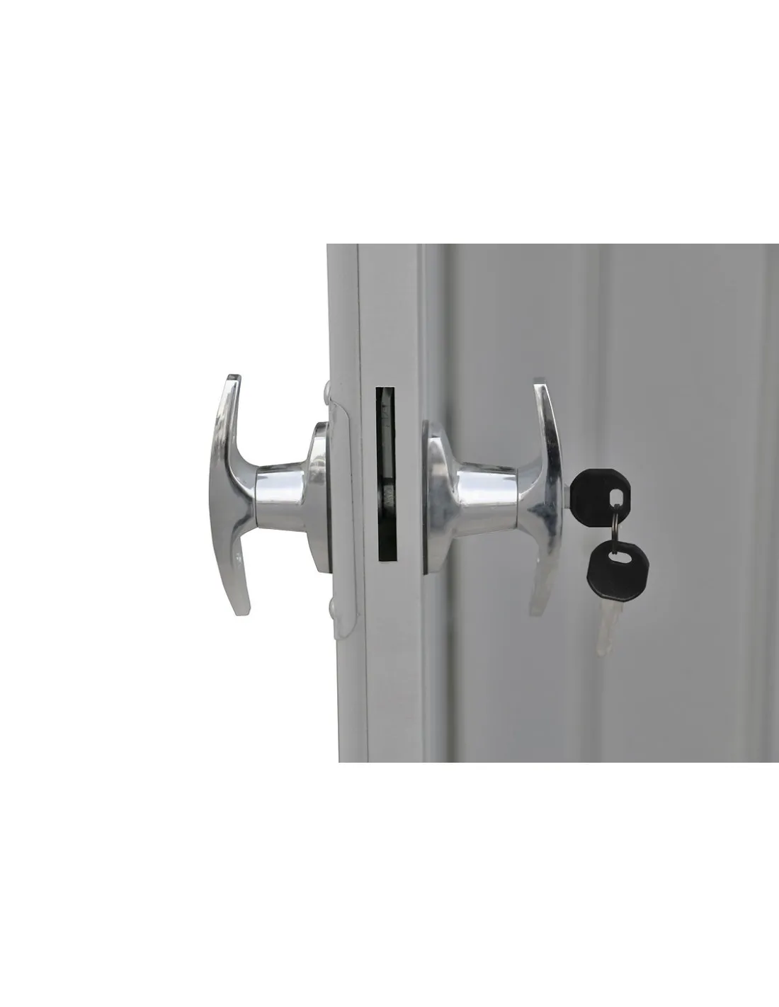 Cuenta con una superficie útil de 5,21 m2. El fácil acceso al habitáculo a través de una puerta de una hoja batiente con una altura de 1,80 metros. Además dispone de una cerradura de cierre de cilindro de acero inoxidable.