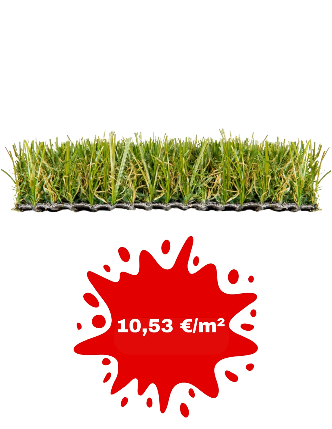 COMFORT 30 es un césped artificial de 30 mm de altura de pelo que combina seis colores, cuatro tonos de verde, un tono de marrón y un tono de beige que le dan un gran realismo.