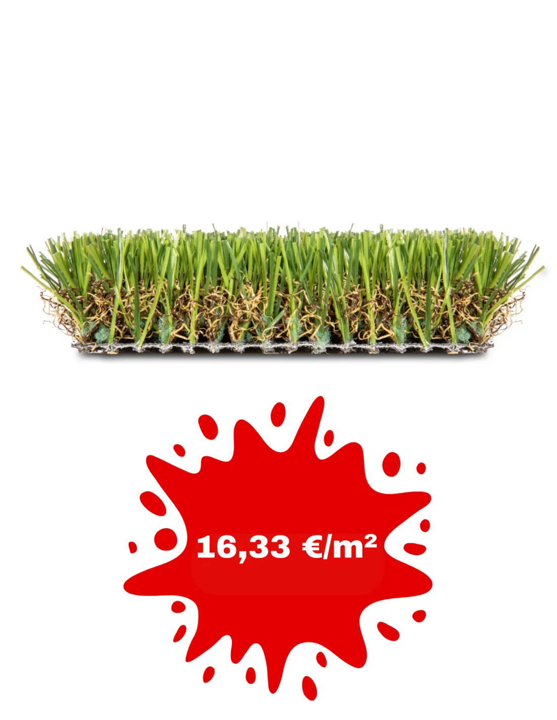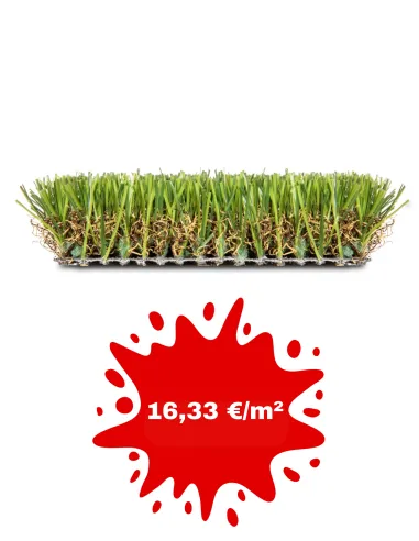 - Backing primario: Doble capa de polipropileno estabilizada resistente a rayos UV + fleece para una mayor estabilidad dimensional de 250 gr/m2 (+/- 10%)