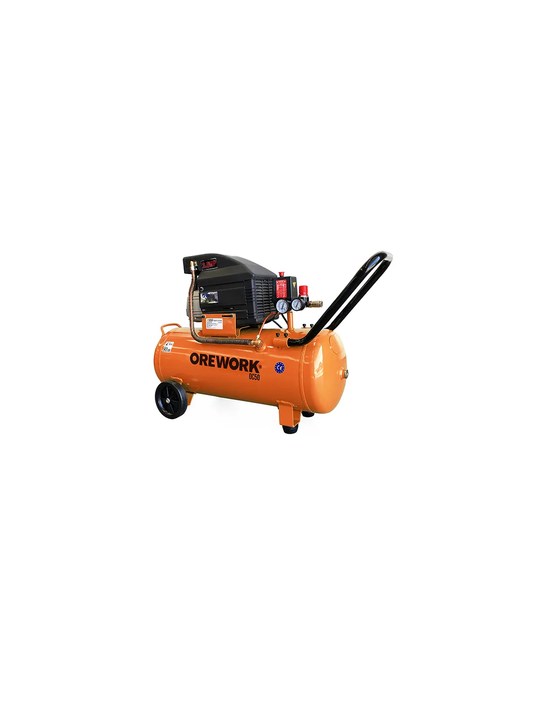 Compresor Orework, modelo OC50, desarrollado para tareas de pintura, carpintería, tapicería, etc. Máquina compacta, muy sencilla de manejar, con asa para un transporte más ergonómico y ruedas robustas que permiten un desplazamiento rápido. Modelo de 220-240 V, con un tanque de 50 litros y un caudal a 90 PSI de 6,57 CFM. Este compresor trabaja con una presión máxima de 8 bares.
