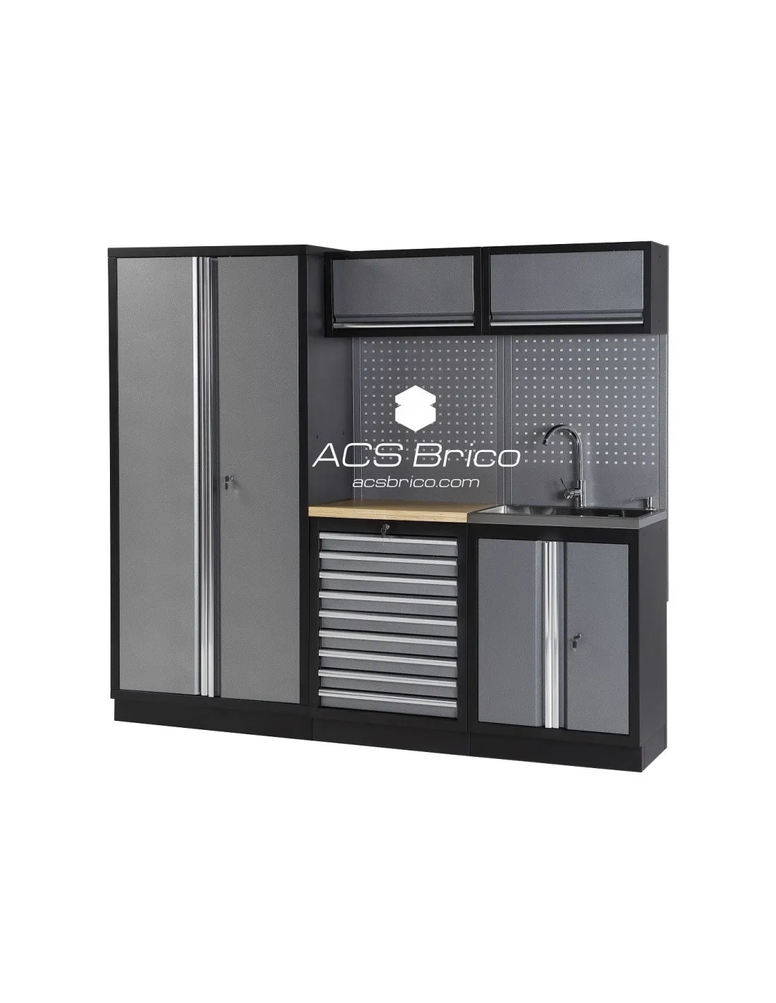 NOTA: El montaje de estos conjunto de taller es muy fácil. Los muebles bajos y los muebles altos del conjunto de taller vienen montados. Solo hay que atornillar los pilares a los muebles bajos, enganchar los paneles perforados y por último los muebles altos. (Ver vídeo del montaje en la parte inferior)