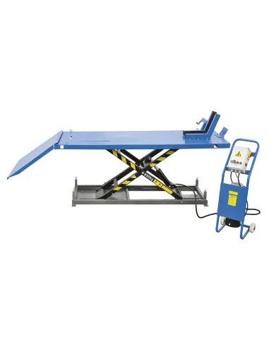El elevador electro-hidráulico con bomba y sistema de control separado, le da la posibilidad de colocarlo a nivel del suelo. Es ideal para motos, pues permite la cómoda reparación de vehículos de dos ruedas como ciclomotores, scooters y motocicletas con un peso máximo de 600 kg. Diseño compacto y, por lo tanto, muy apropiado para talleres tanto pequeños como grandes.