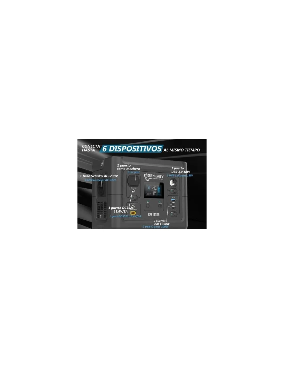 Es una fuente de energía que no requiere de combustibles y, por tanto, no genera emisiones. Dispone de múltiples opciones de puertos de salida para todo tipo de dispositivos y es compatible para alimentar una amplia gama de aparatos con diferentes tomas de corriente de salida: Schuko, toma de mechero, puertos USB o puerto DC5521. Energía limpia y respetuosa con el medio ambiente, cómoda y práctica para las personas.