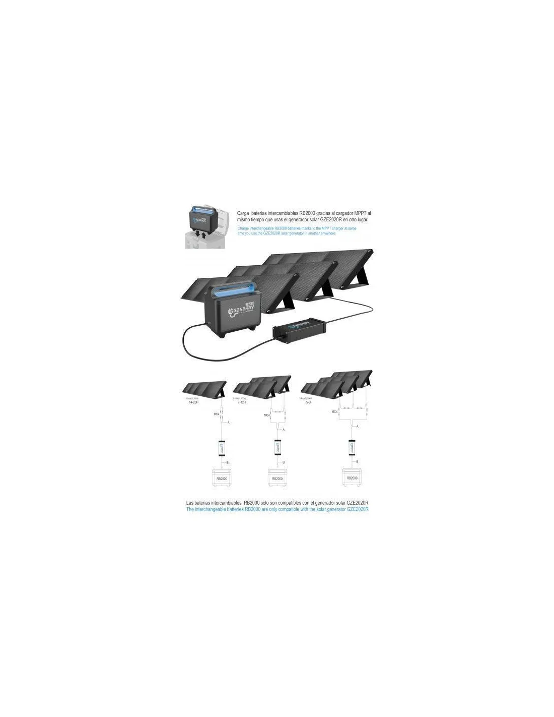 Carga baterías intercambiables RB2000 de la prestigiosa marca Genergy gracias al cargador MPPT al mismo tiempo que usas el generador solar GZE2020R en otro lugar (Opcional).