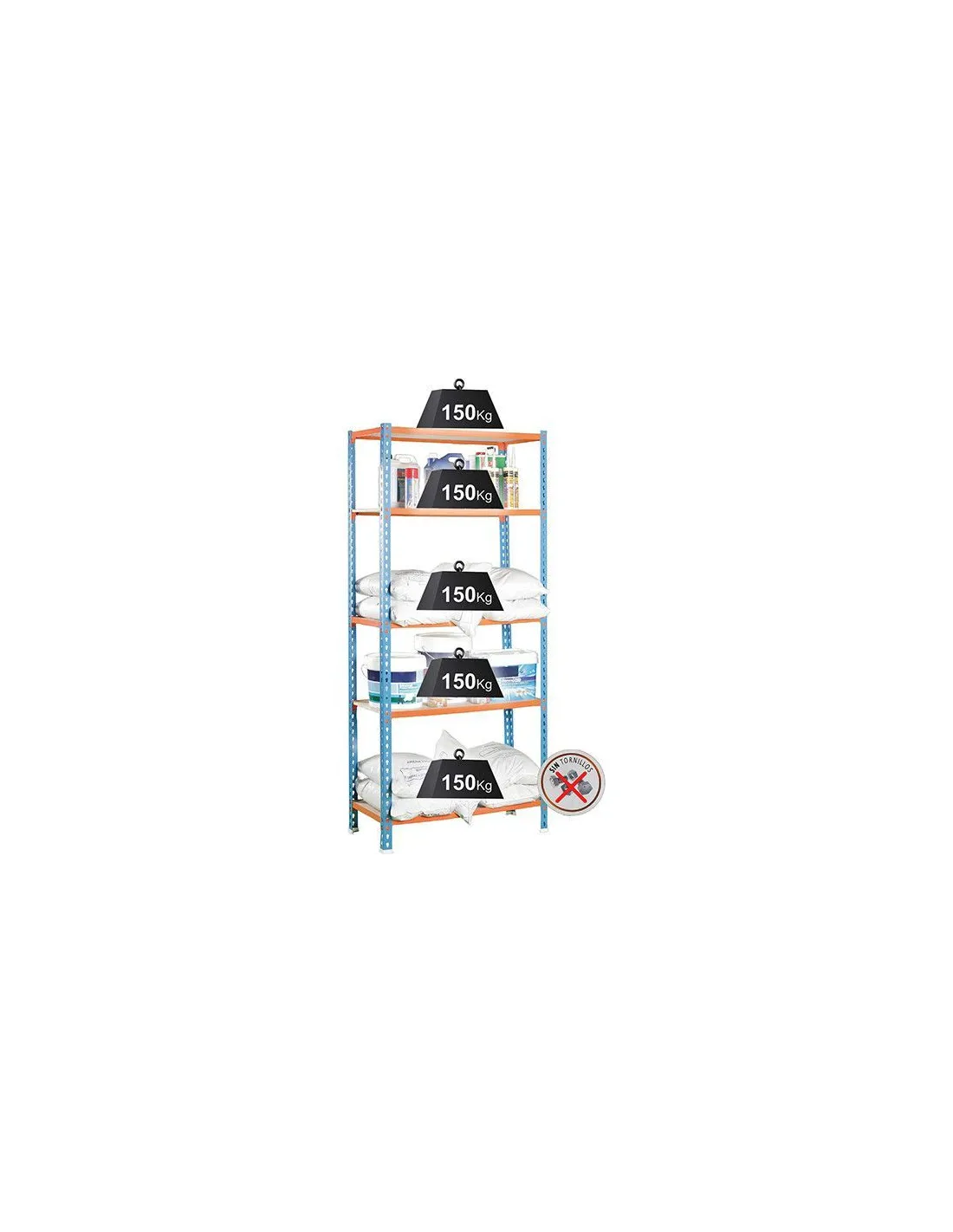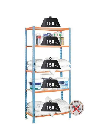 Perfiles de 1,7 mm de espesor y 5 repisas de madera aglomerada de 12 mm de espesor. Soporta una carga máxima (uniformemente repartida) de 750 kilos (150 kilos por balda).