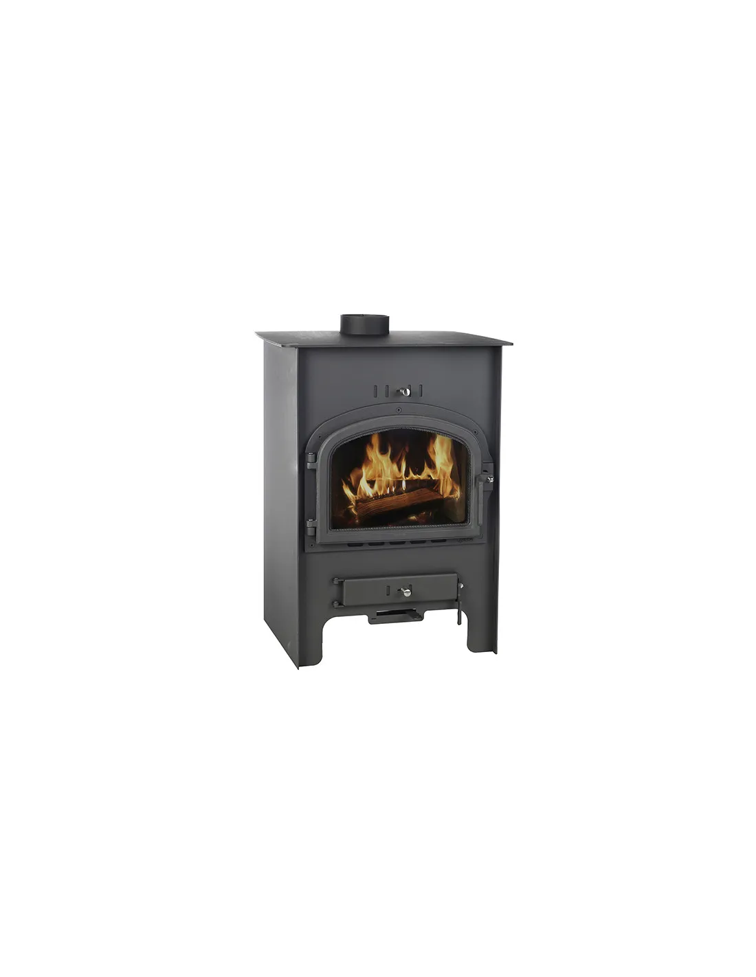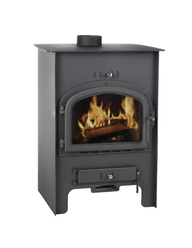 Estufa de leña, modelo 400 Oslo EcoDesign, de triple combustión. Incorpora puerta de fundición, cámara con vermiculita refractaria, sistema de limpieza de cristal y doble cámara de acero con un espesor de 3 mm. Esta estufa presenta una potencia máxima de 15,9 kW (nominal 6,8 kW), carga máxima de 3,5 kg, rendimiento del 78% y salida vertical de humos.