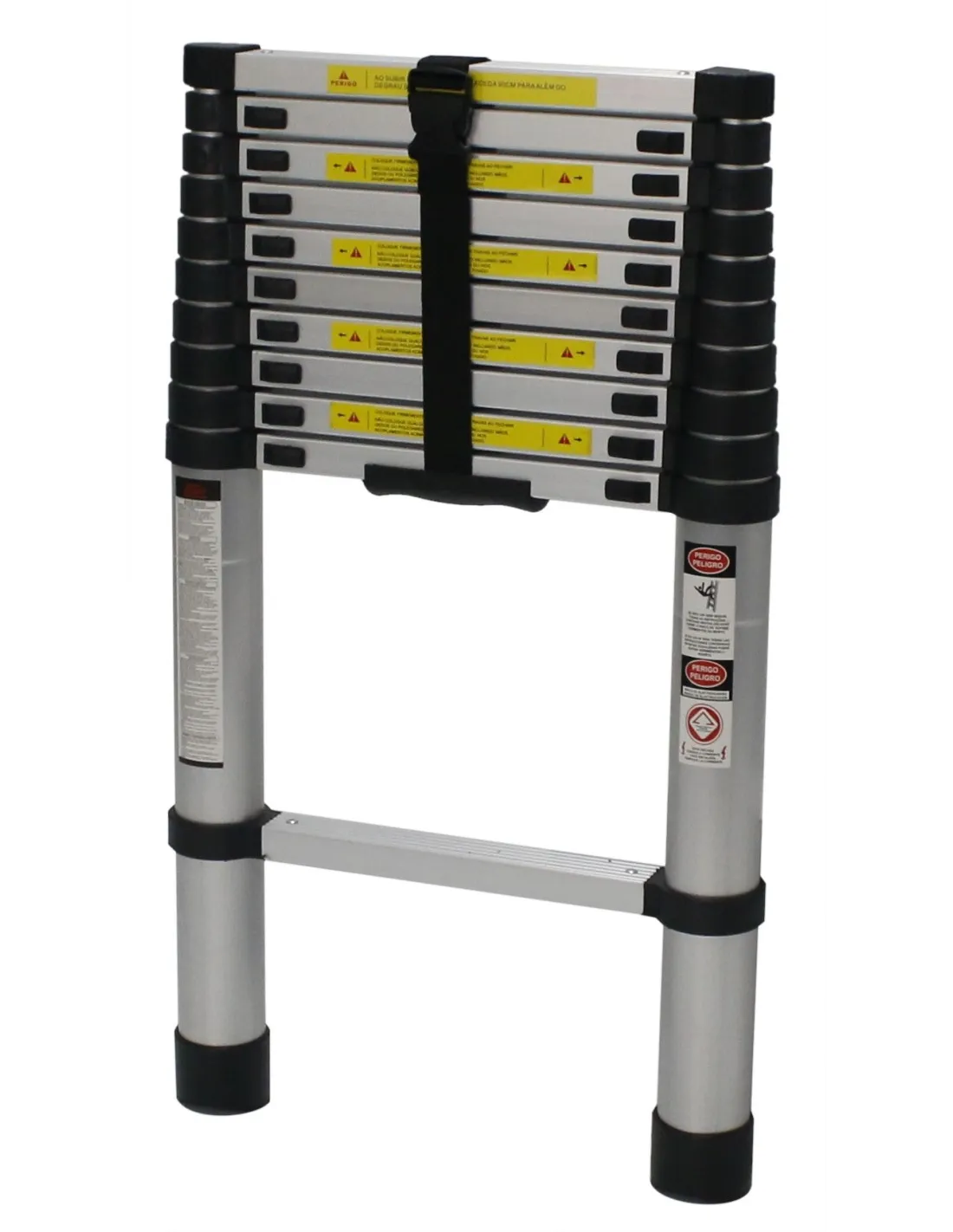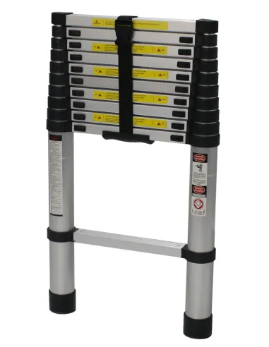 Escalera telescópica tubular de refinado diseño. Con mecanismo de bloqueo automático en extensión y desbloqueo en el repliegue. Gracias a sus reducidas dimensiones, permite ser guardada en espacios reducidos. Elegante acabado en aluminio anodizado de alta calidad de limpio tacto. Tacos ergonómicos antideslizantes.