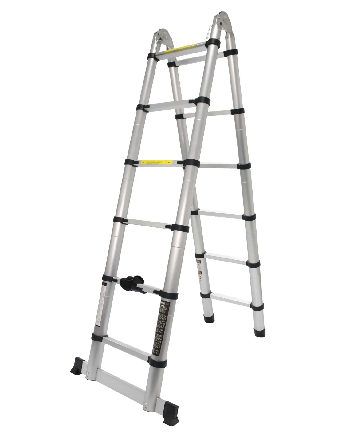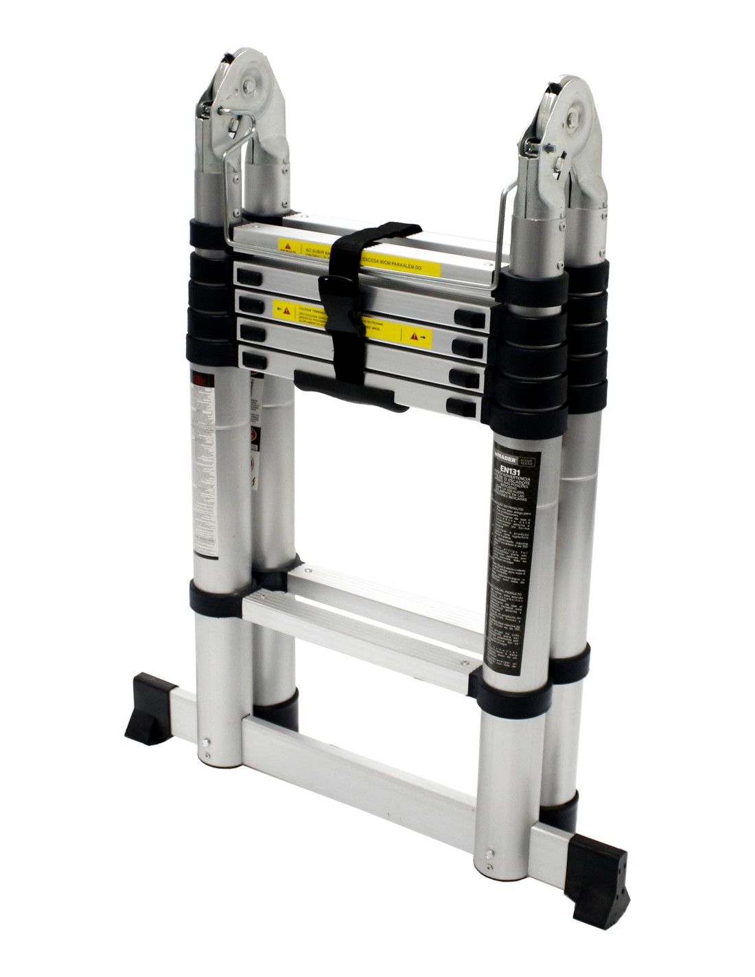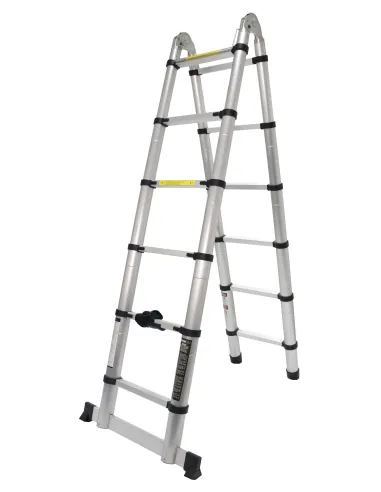 Escalera doble telescópica tubular de refinado diseño. Con mecanismo de bloqueo automático en extensión y desbloqueo en el repliegue. Gracias a sus reducidas dimensiones, permite ser guardada en espacios reducidos. Elegante acabado en aluminio anodizado de alta calidad de limpio tacto. Tacos ergonómicos antideslizantes.