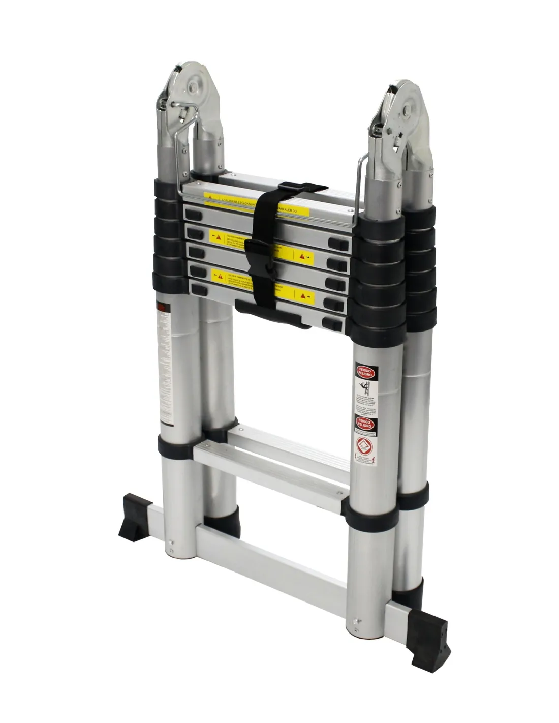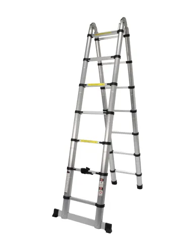 Escalera doble telescópica tubular de refinado diseño. Con mecanismo de bloqueo automático en extensión y desbloqueo en el repliegue. Gracias a sus reducidas dimensiones, permite ser guardada en espacios reducidos. Elegante acabado en aluminio anodizado de alta calidad de limpio tacto. Tacos ergonómicos antideslizantes.