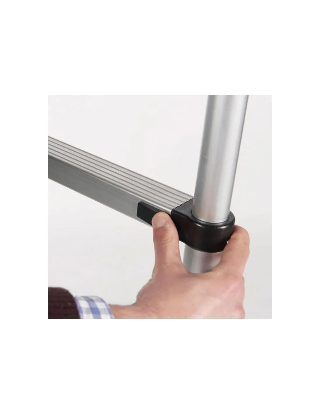 Escalera telescópica tubular de refinado diseño. Con mecanismo de bloqueo automático en extensión y desbloqueo en el repliegue. Gracias a sus reducidas dimensiones, permite ser guardada en espacios reducidos. Elegante acabado en aluminio anodizado de alta calidad de limpio tacto. Cómodo peldaño antideslizante de 40 x 40 mm. y tacos ergonómicos antideslizantes.