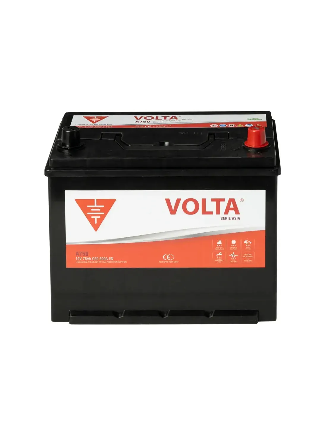 La batería para coches de marca asiática Volta A750D 75Ah 600A es un modelo perteneciente a la gama Asia de la marca Volta, especialmente diseñada para las marcas de coches asiáticas. Esta batería cuenta con una capacidad de 75Ah y una potencia de arranque de 600A EN, lo que la hace ideal para los vehículos con altas demandas energéticas.