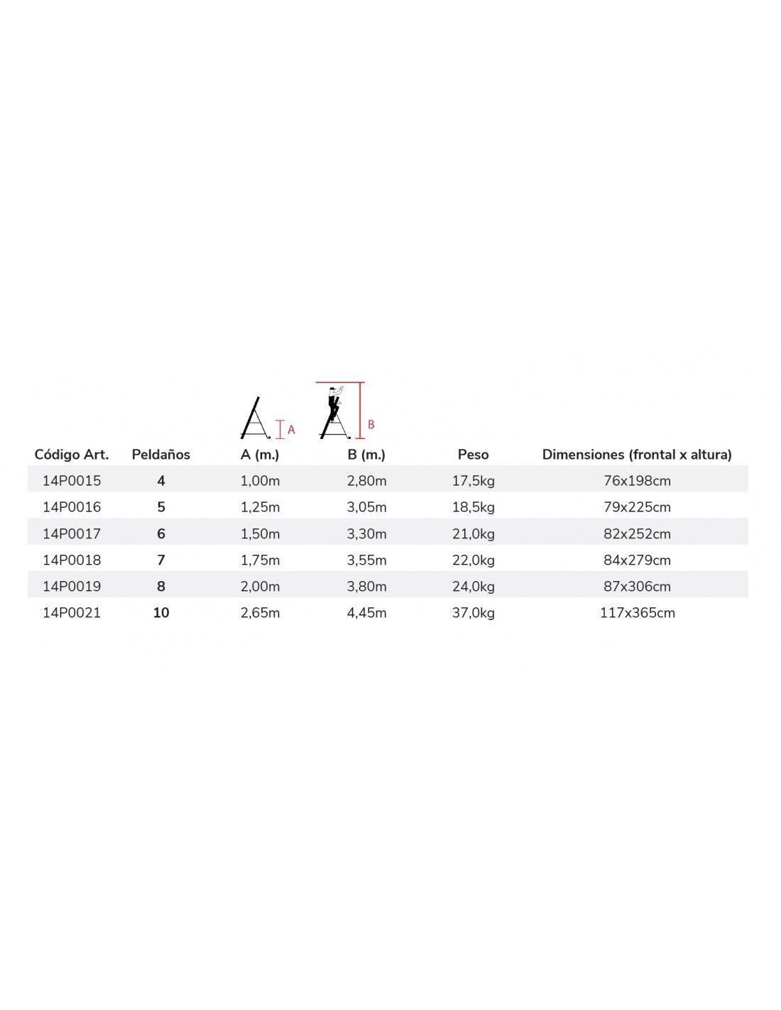Plataforma de trabajo antideslizante de 42x53 cm. Rodapiés a partir de los 10 peldaños.