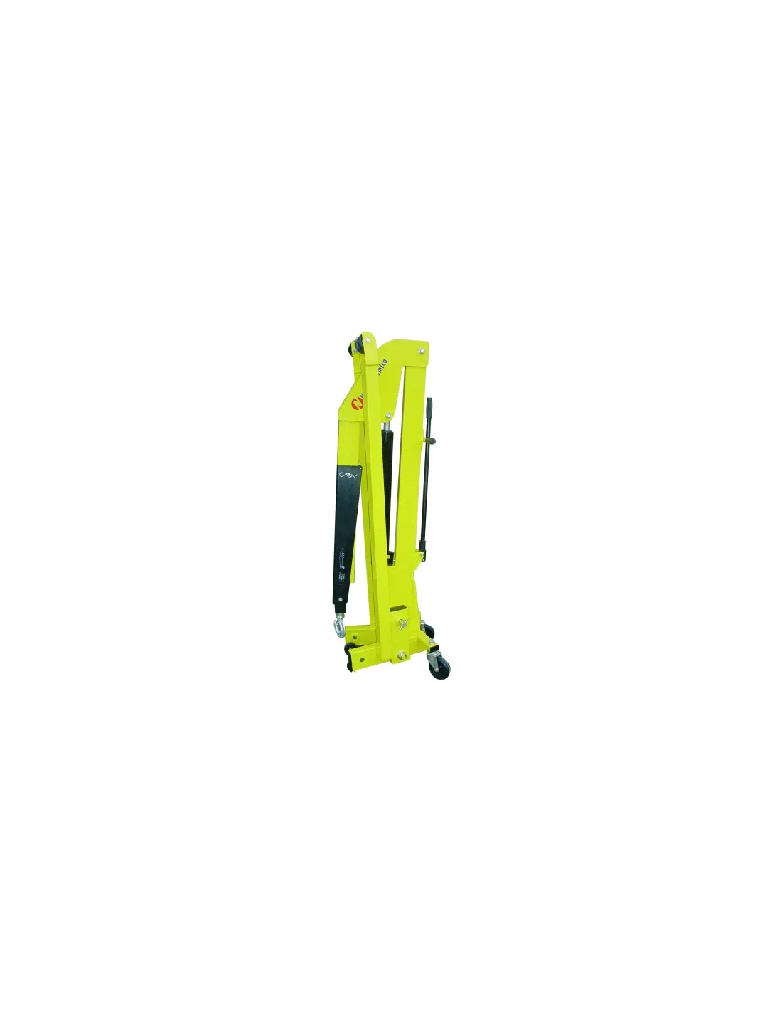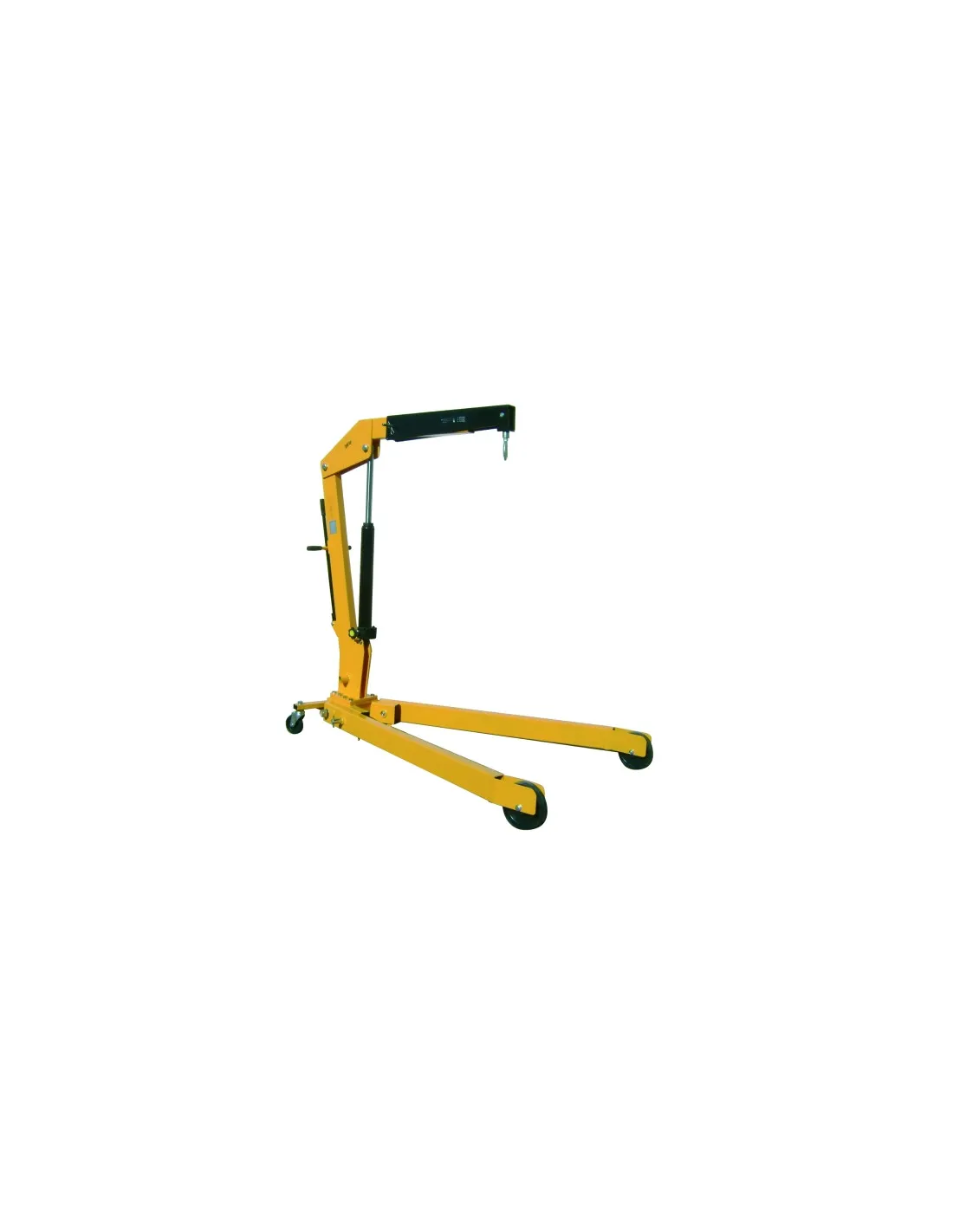 Grúa plegable de 2.000 kg, controlada mediante una bomba manual, muy manejable. Posee ruedas de nylon. Posibilidad de posicionar el brazo de la grúa en tres posiciones distintas. Gancho forjado muy resistente y giratorio. Marcado CE.