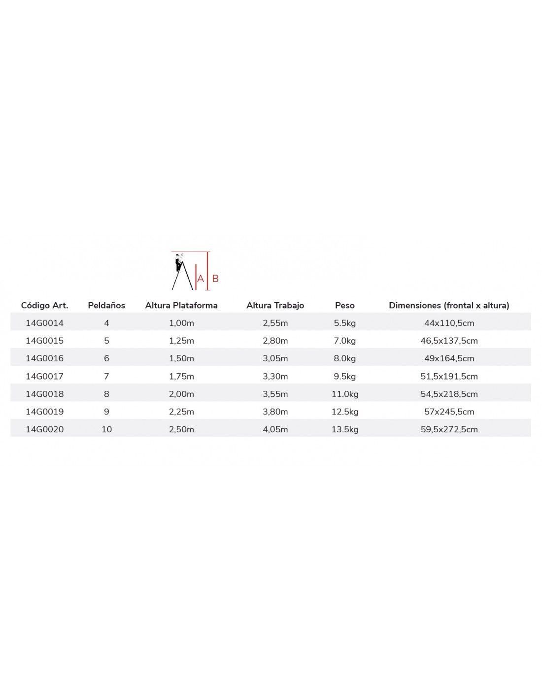 Perfil de 80x30 mm con peldaños anchos de 8 cm antideslizantes. Evita la fatiga en trabajos prolongados.