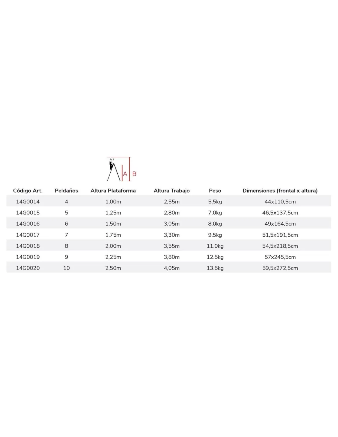 Perfil de 80x30 mm con peldaños anchos de 8 cm antideslizantes. Evita la fatiga en trabajos prolongados.