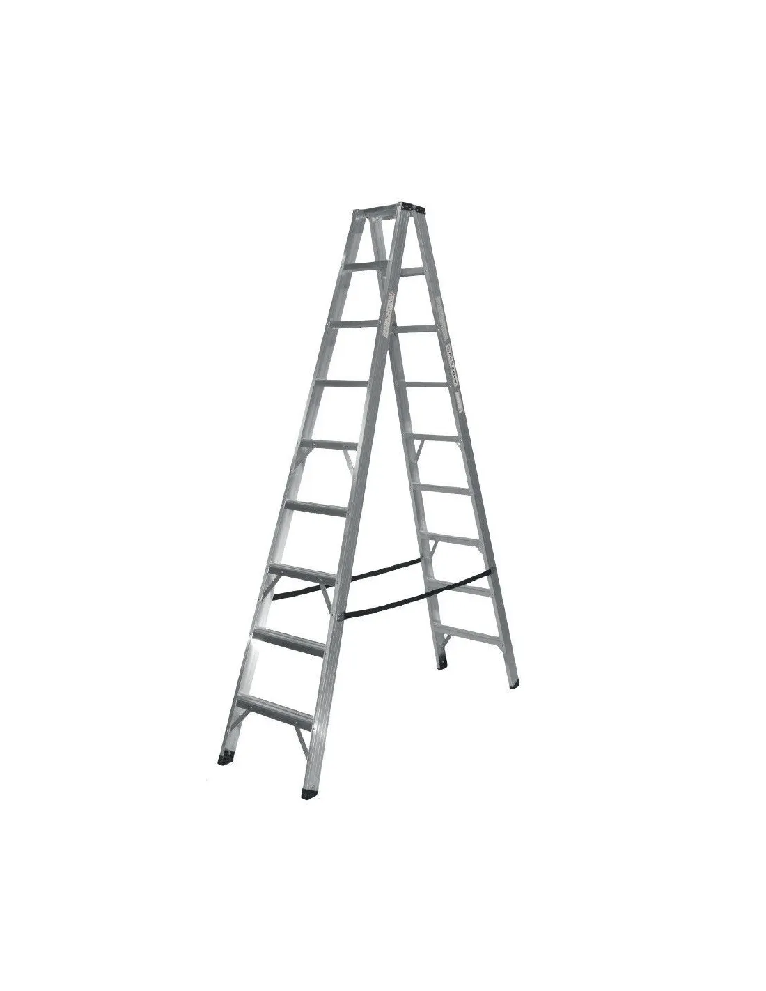 Resistente estructura de aluminio soldado con refuerzos en los peldaños.