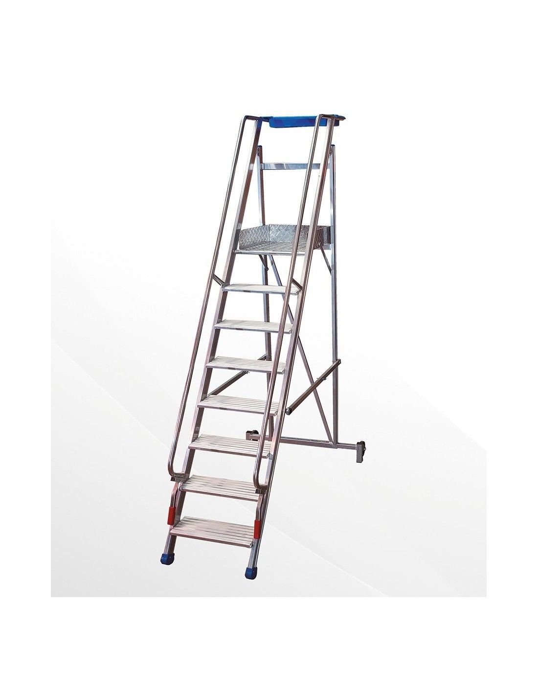 Escalera industrial plegable para almacén fabricada en aluminio extrusionado. Perfil estructurado delantero de 84x25mm y trasero de 67x25mm. Pasamanos de tubo redondo soldado a todo perfil. Incorpora dos empuñaduras plegables para facilitar su traslado. Dotada con dos rueda de 150mm.