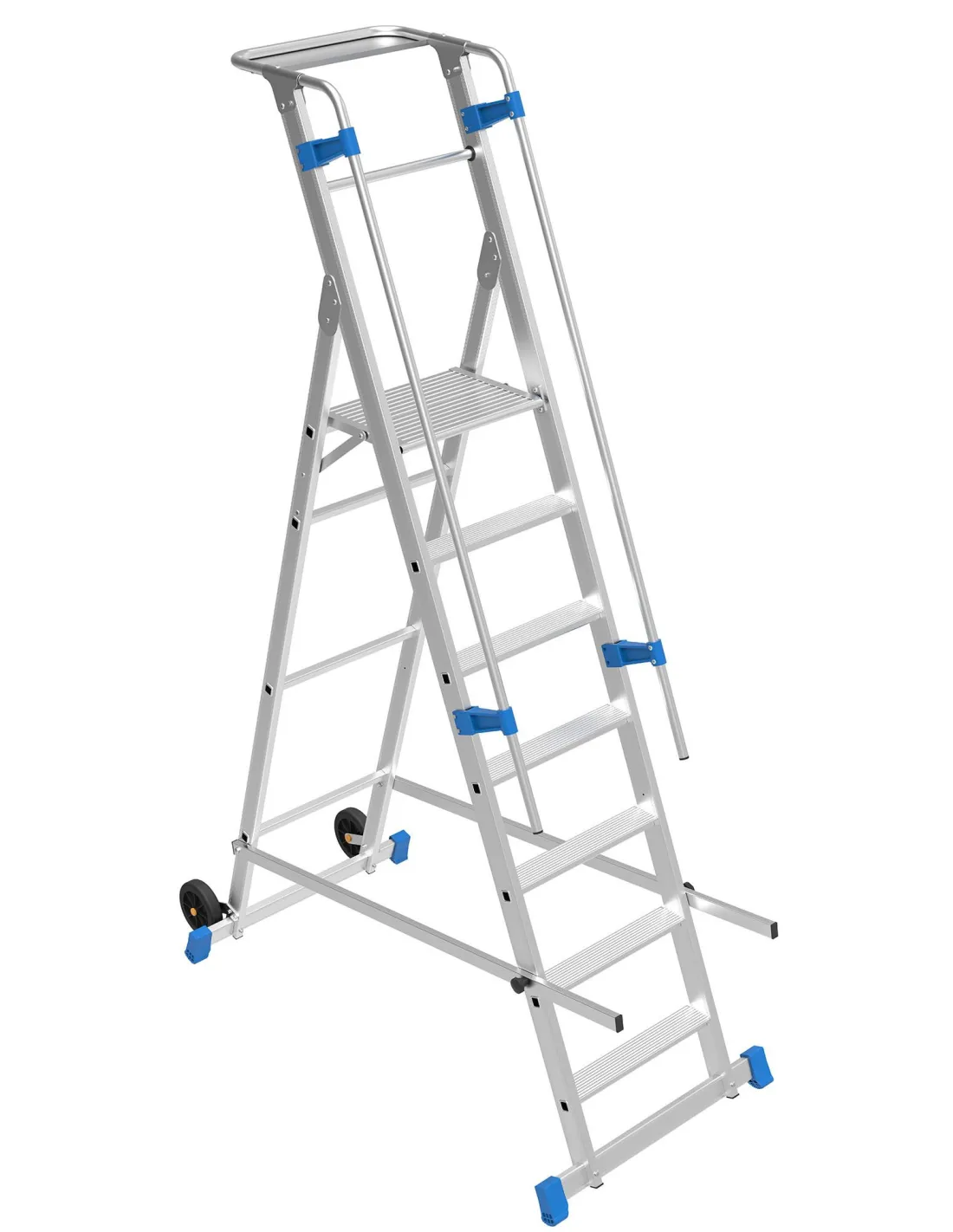 La Escalera de Almacén CASTELLO 05 de Marchetti está hecha de aluminio, con peldaños de 80mm y una plataforma de 470x370mm. Permite un peso máximo de 150 kilos y dispone de dos ruedas que facilitarán su desplazamiento. Pensada para profesionales cuyas faenas requieran de periodos de tiempo prolongados encima de la escalera.