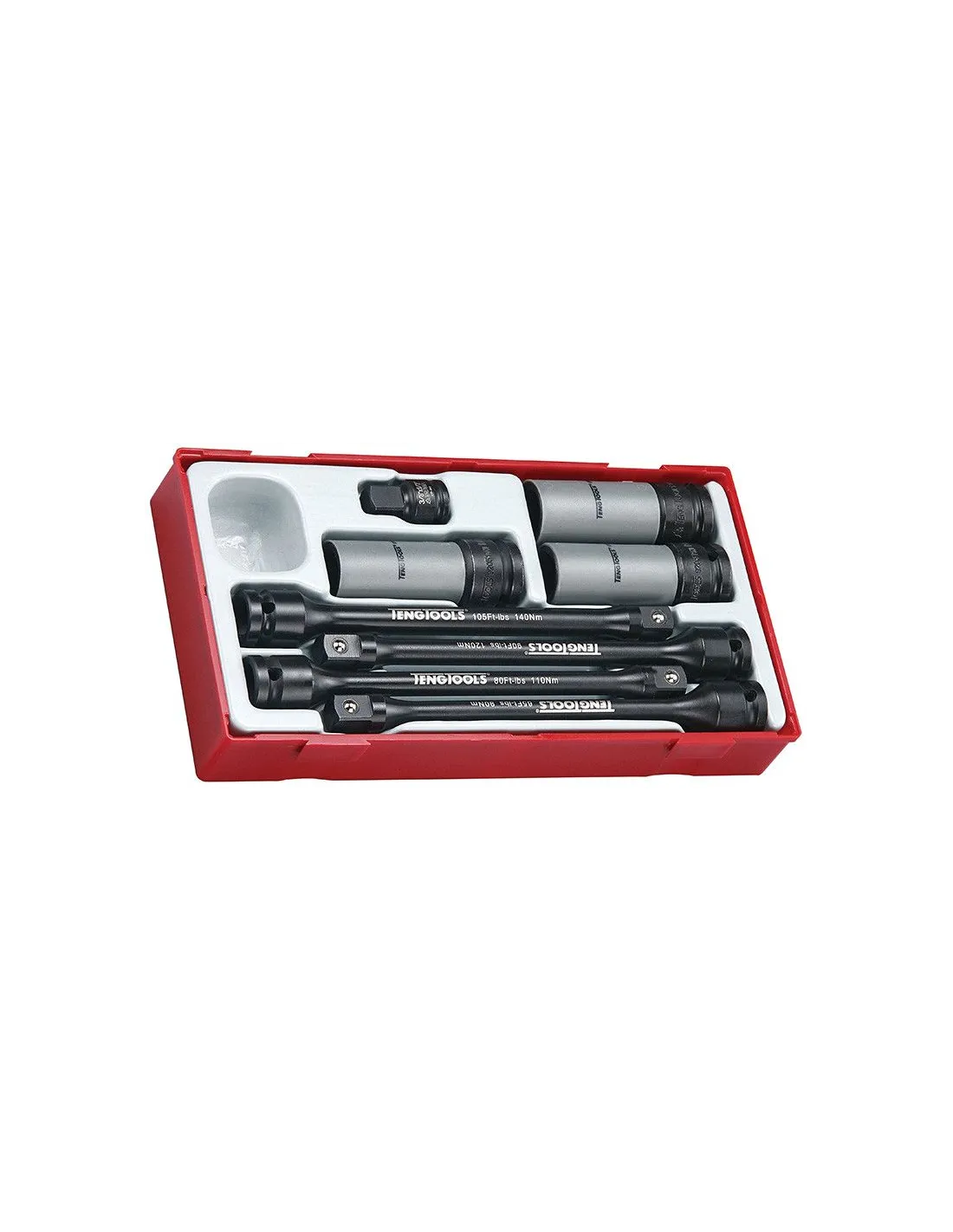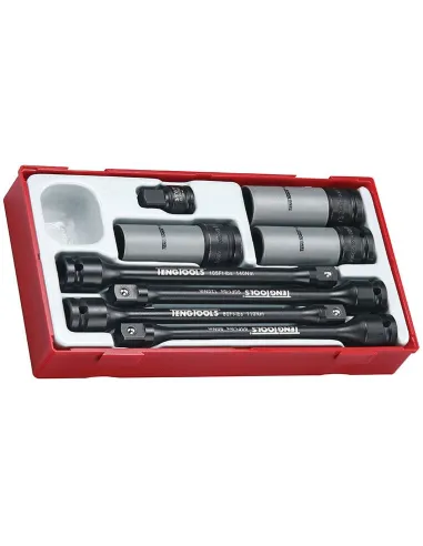 Conjunto de vasos y barras de torsión para apretar las ruedas de los coches. Cuando se alcanza el par de apriete previsto el vaso se detiene mientras el extremo de accionamiento salta hacia atrás a cada golpe. Reduce el riesgo de tornillos rotos o llantas deformadas.